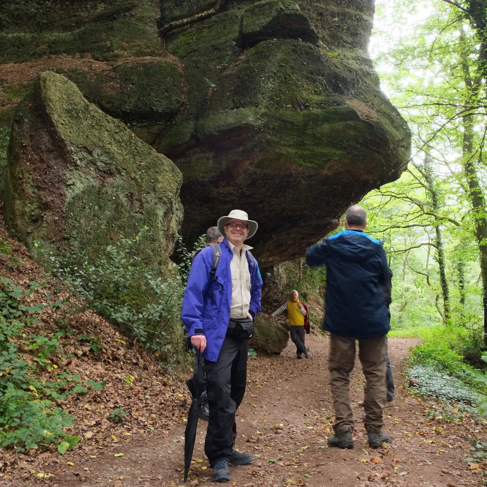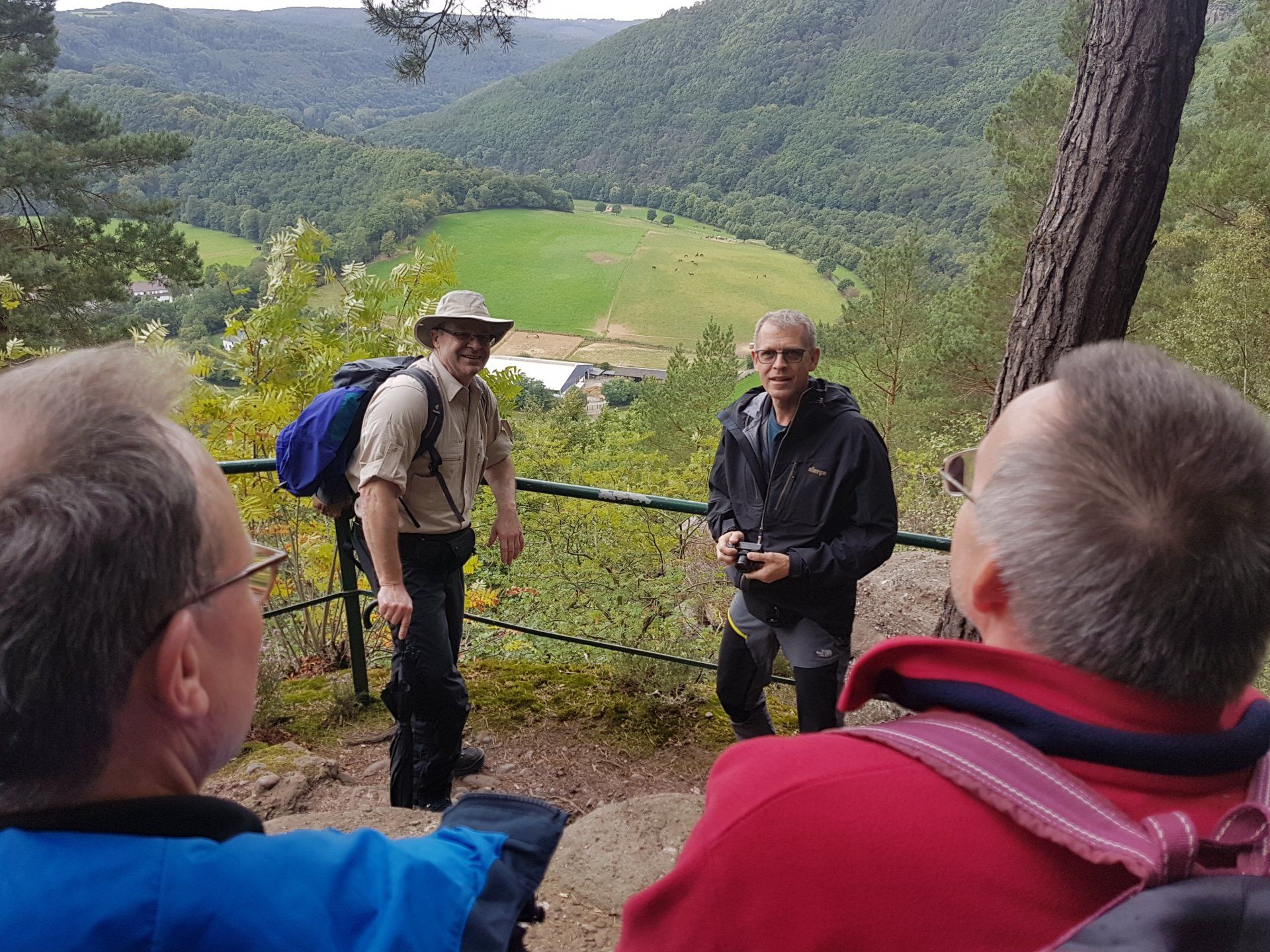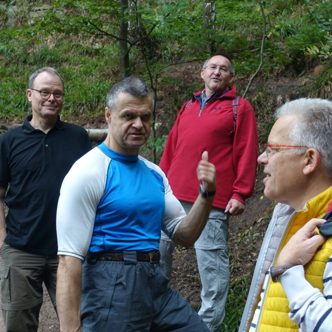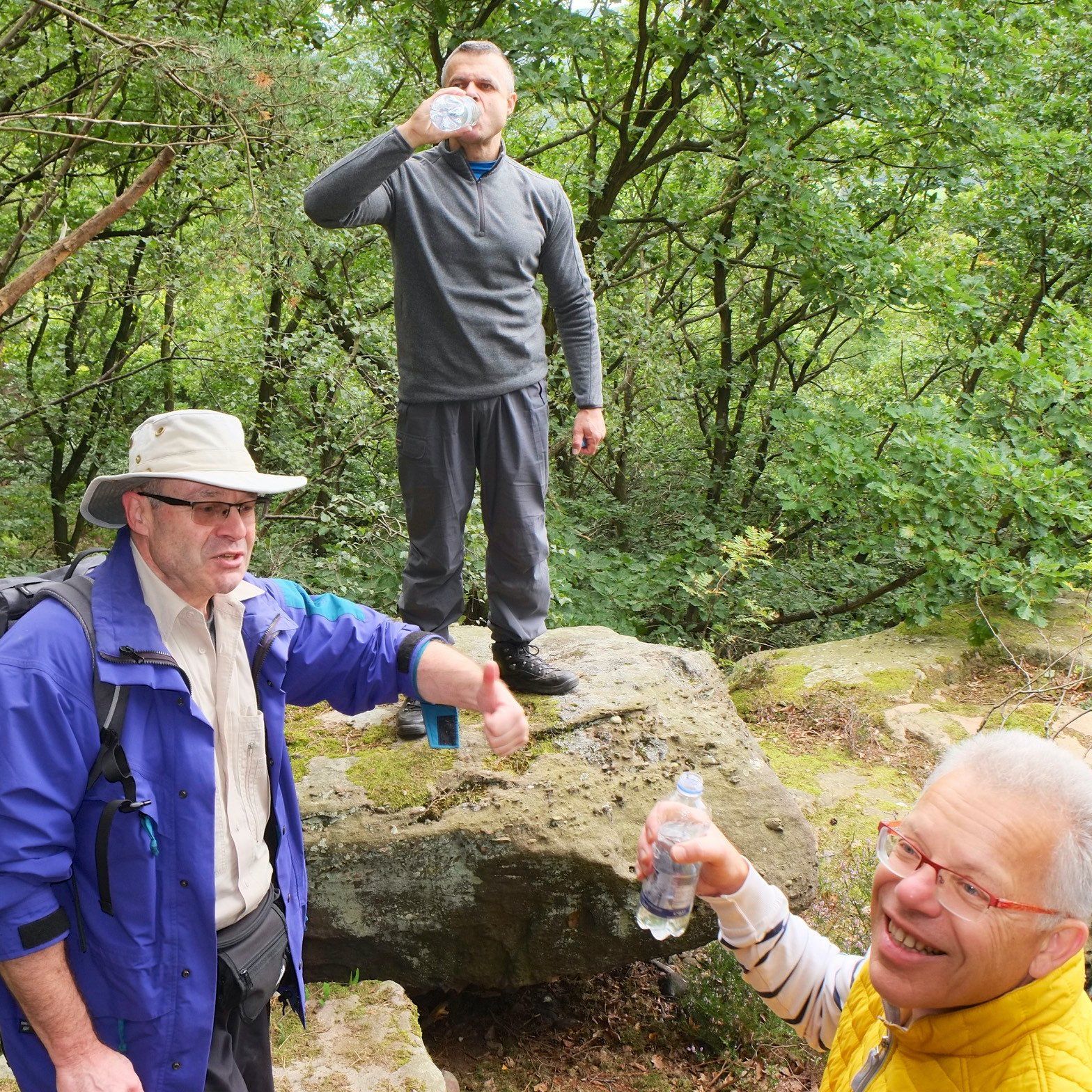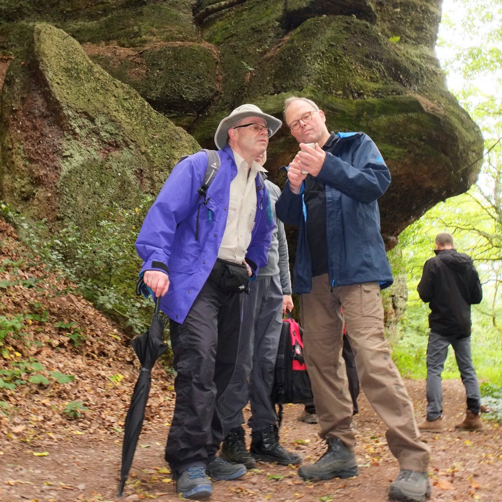 Gleich nach dem ersten Frühstück stand für die Herrenwanderer eine ebenso lehrreiche, wie beeindruckende Wanderung auf dem Programm – die imposante Felspassage! Sie führte unterhalb der Buntsandsteinfelsen zwischen Obermaubach und Nideggen am Rurtal entlang. Stellenweise ging es steil bergauf, Klettersicherheit war gefragt. Aus dem Buntsandstein entstanden übrigens einst die Burg Nideggen sowie weitere Gebäude der Region! Aber auch Mühlsteine hat man aus dem Fels geschlagen. Heute wird hier nur noch gewandert – und das ist gut so. Gut gelaunte Mittagsrast im