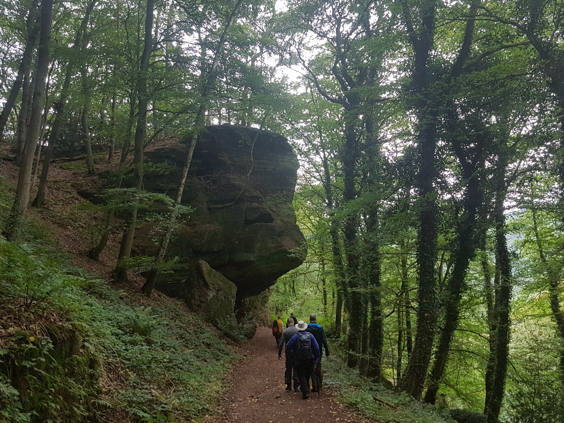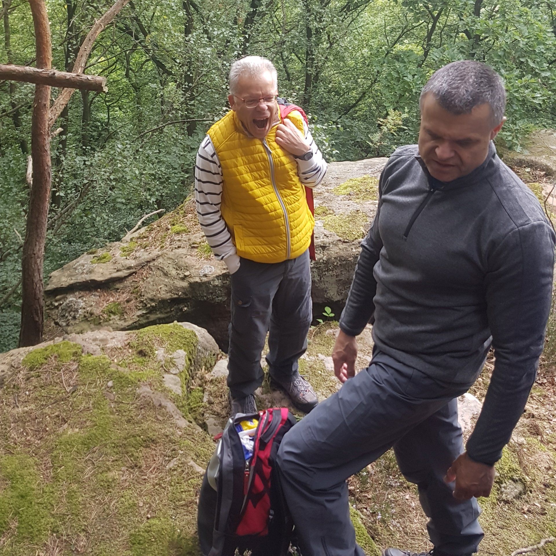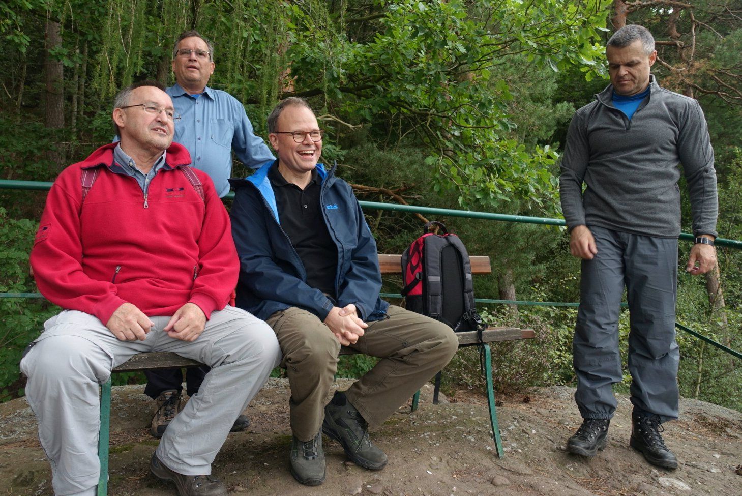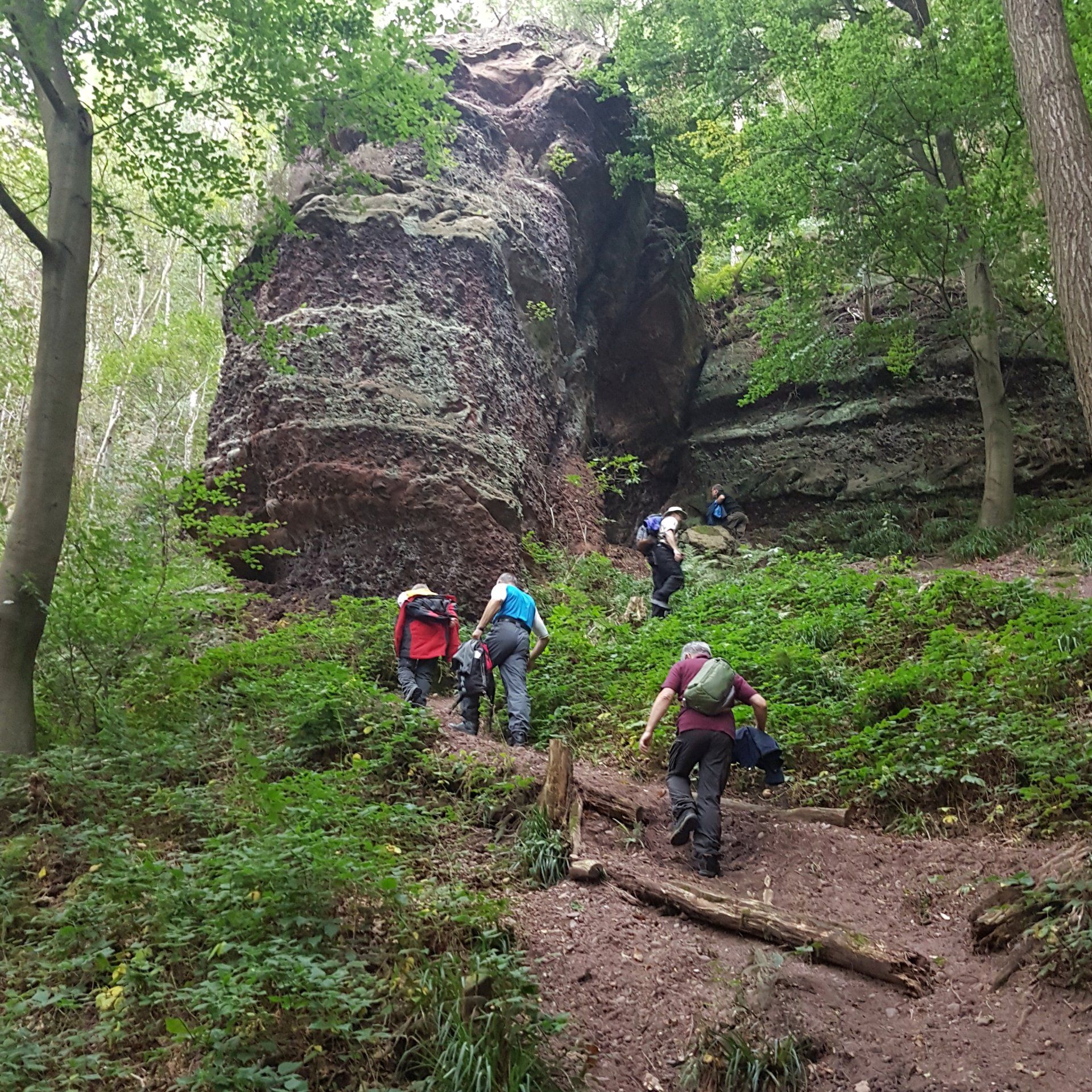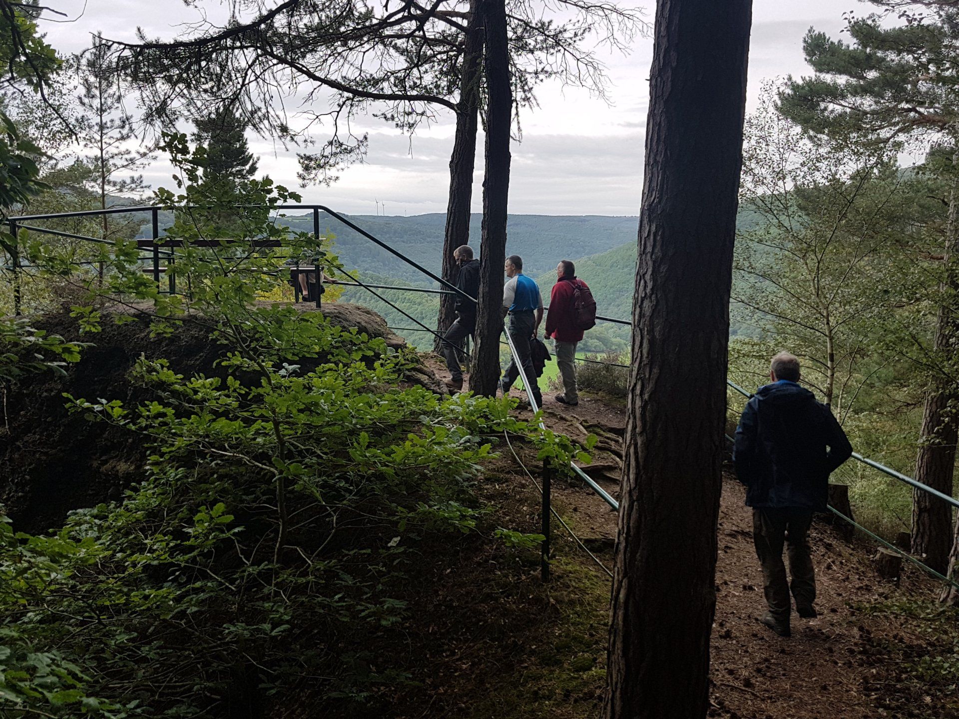 Gleich nach dem ersten Frühstück stand für die Herrenwanderer eine ebenso lehrreiche, wie beeindruckende Wanderung auf dem Programm – die imposante Felspassage! Sie führte unterhalb der Buntsandsteinfelsen zwischen Obermaubach und Nideggen am Rurtal entlang. Stellenweise ging es steil bergauf, Klettersicherheit war gefragt. Aus dem Buntsandstein entstanden übrigens einst die Burg Nideggen sowie weitere Gebäude der Region! Aber auch Mühlsteine hat man aus dem Fels geschlagen. Heute wird hier nur noch gewandert – und das ist gut so. Gut gelaunte Mittagsrast im