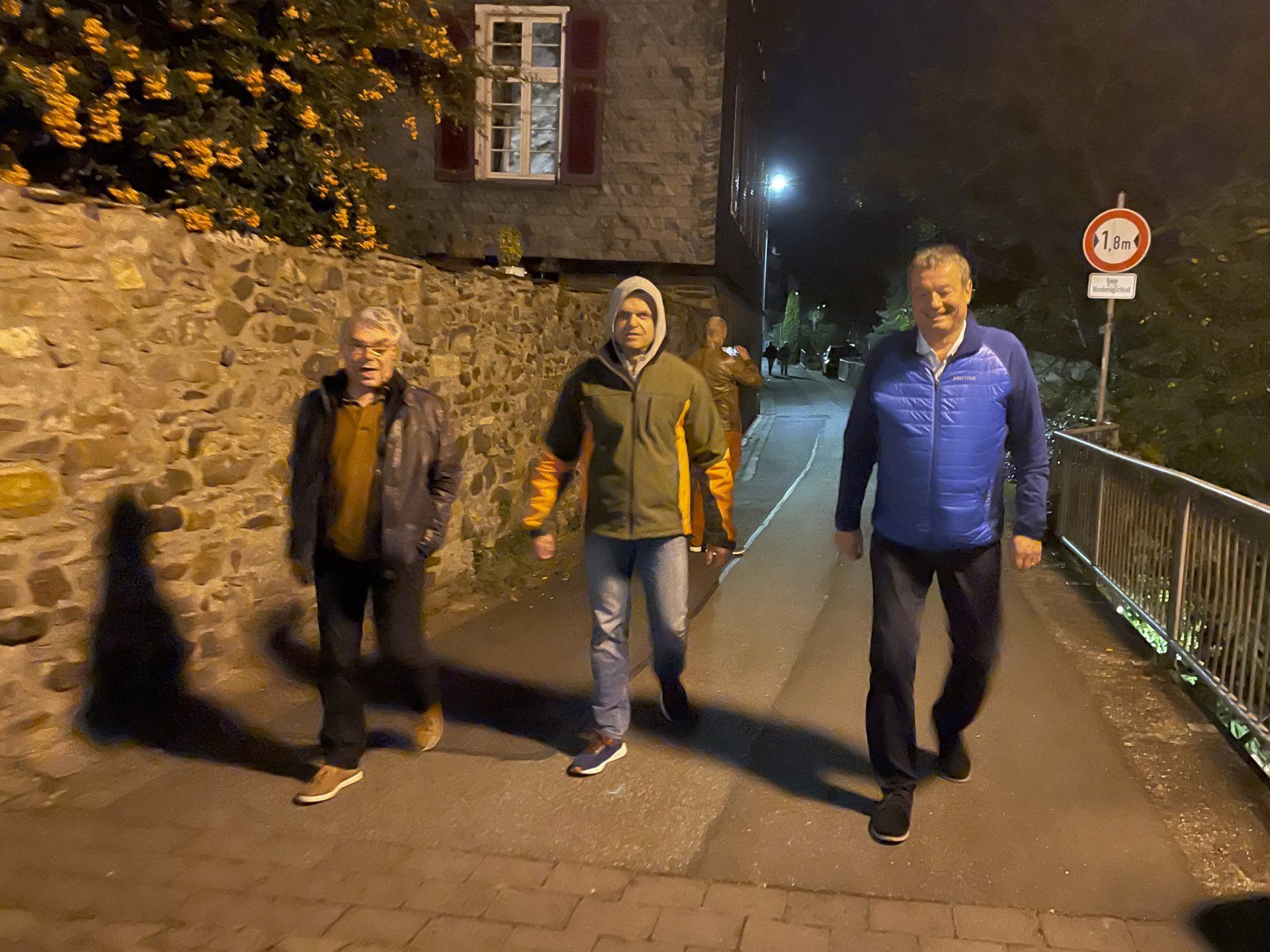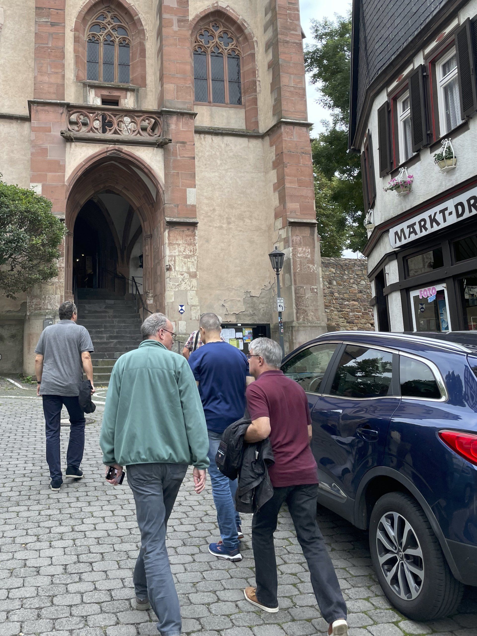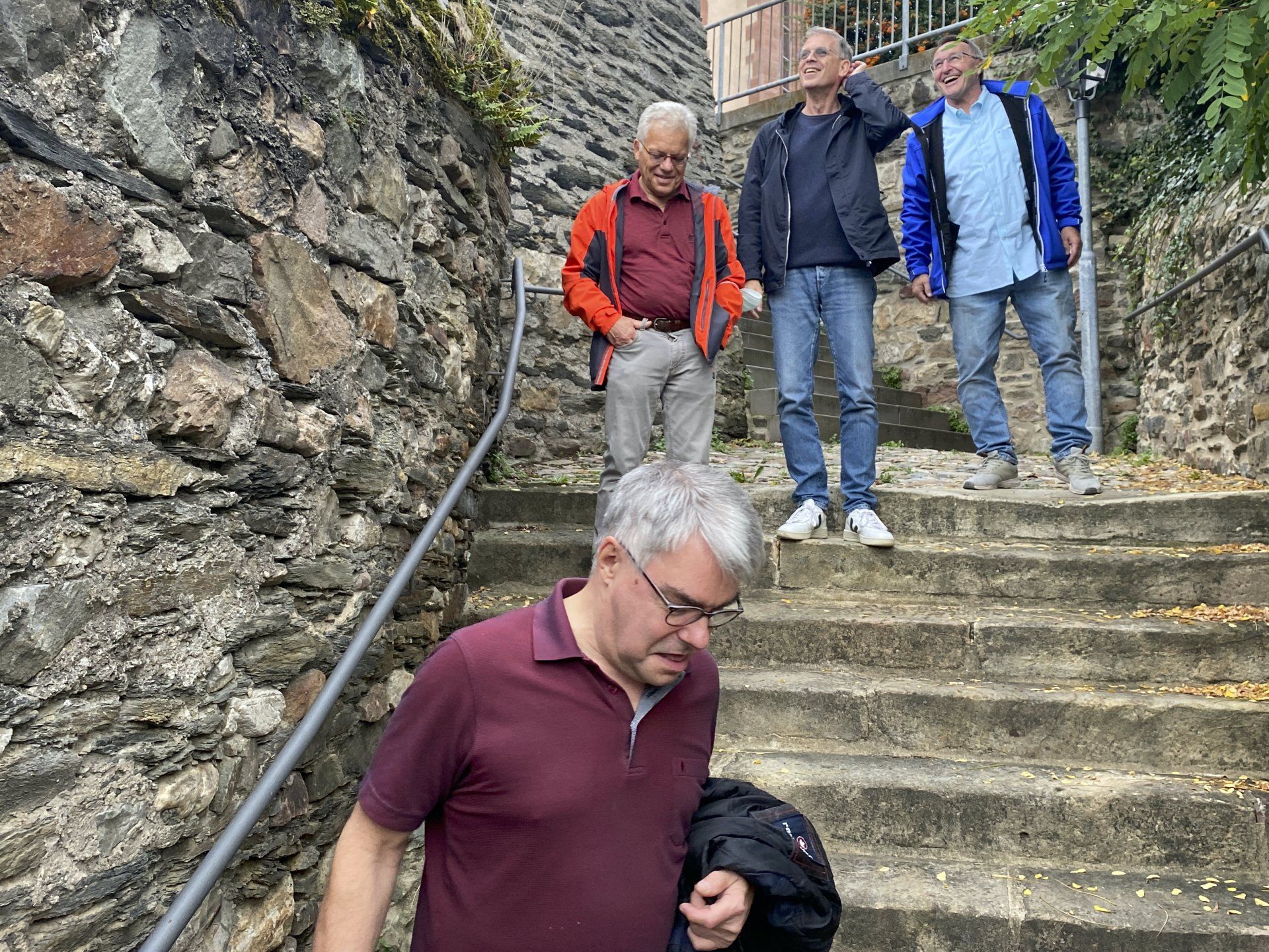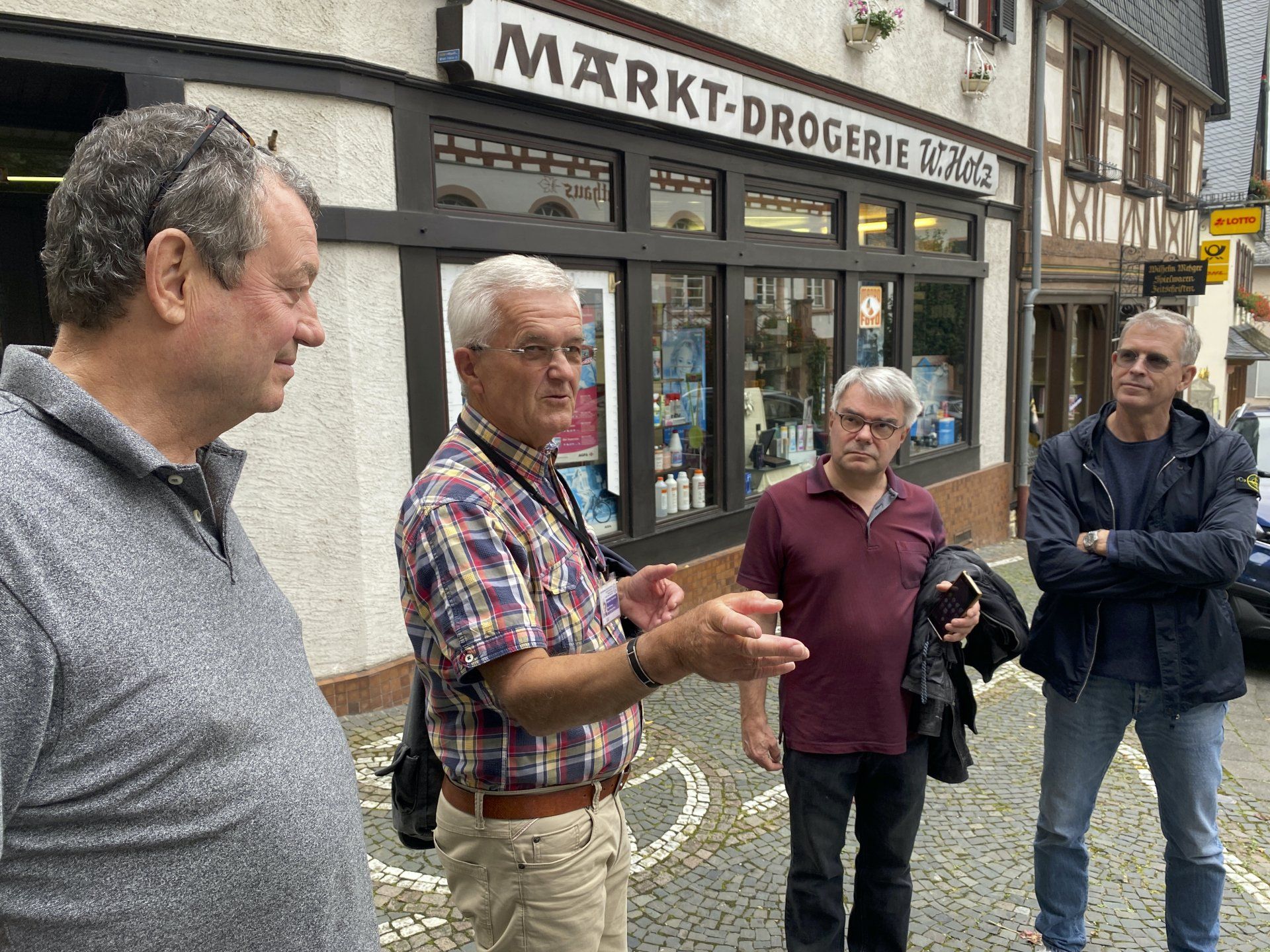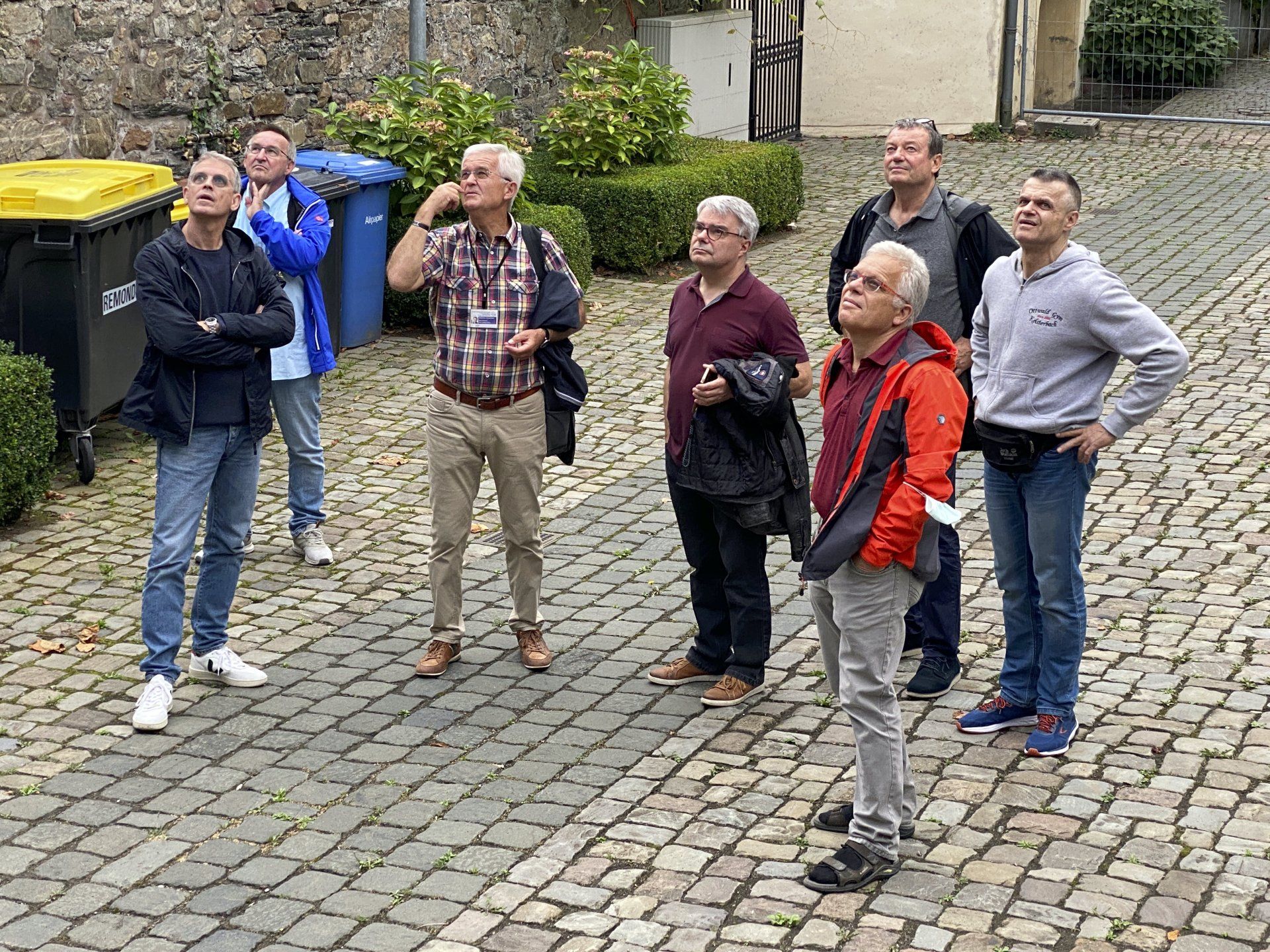 „Hotel im Schulhaus“ im nahe gelegenen Lorch am Rhein, zu treffen. Und zwar – bitteschön – um 16 Uhr. Vielleicht bremste das pfeilschnelle Schlockmobil mit „Seipel, dem Spinner“ himself und seinen von Angstschweiß beträufelten Mitfahrern Dubai-Daum, van Benderchem und dem ab sofort fest in die Truppe integrierten OJJ deshalb erst 50 Minuten zu spät vor dem Hotel – und somit knapp vor Beginn der für den ersten Abend organisierten Führung durch das idyllische Örtchen, das den Herrenwanderern für drei Tage als Homebase diente. Der Wiedehopf war schon Stunden vorher vorbildlich per pedes (auf dem E-Bike) angereist, Bushido und Tourmaster Titte hatten es, mild-hybrid getrieben, von Wiesbaden aus immerhin pünktlich geschafft und bereits ihre Zimmer bezogen. Nach einem schnellen Check-in der „späten Vier“ startete die siebenköpfige Truppe dann zu einem inspirierten Rundgang durch Lorch unter Führung von Herrn Edwin Schneider, der in seinem Heimatort jeden Winkel kennt, pausenlos Bekannte grüßt und die triste Einfallstraße konsequenterweise schnell verließ.