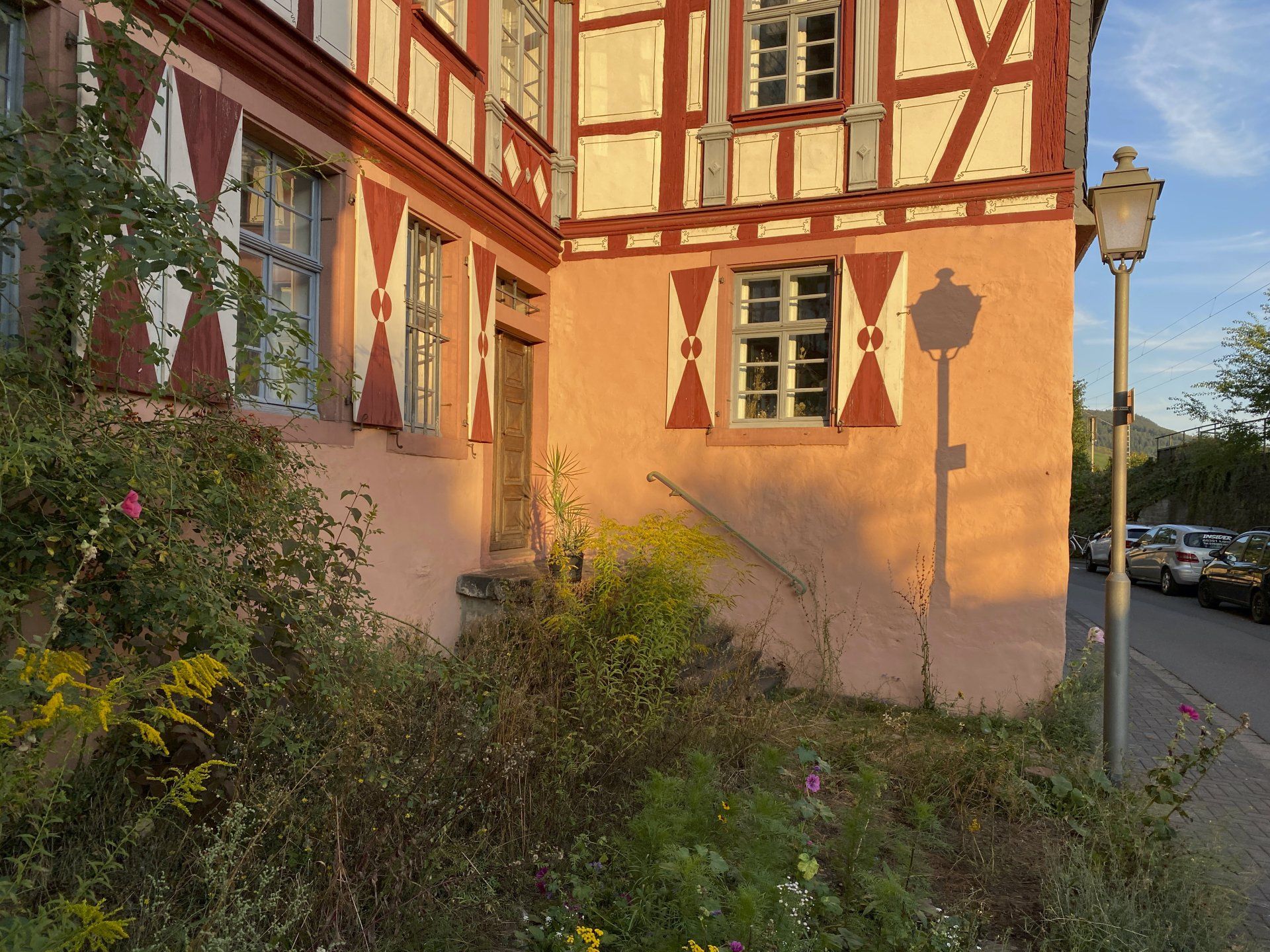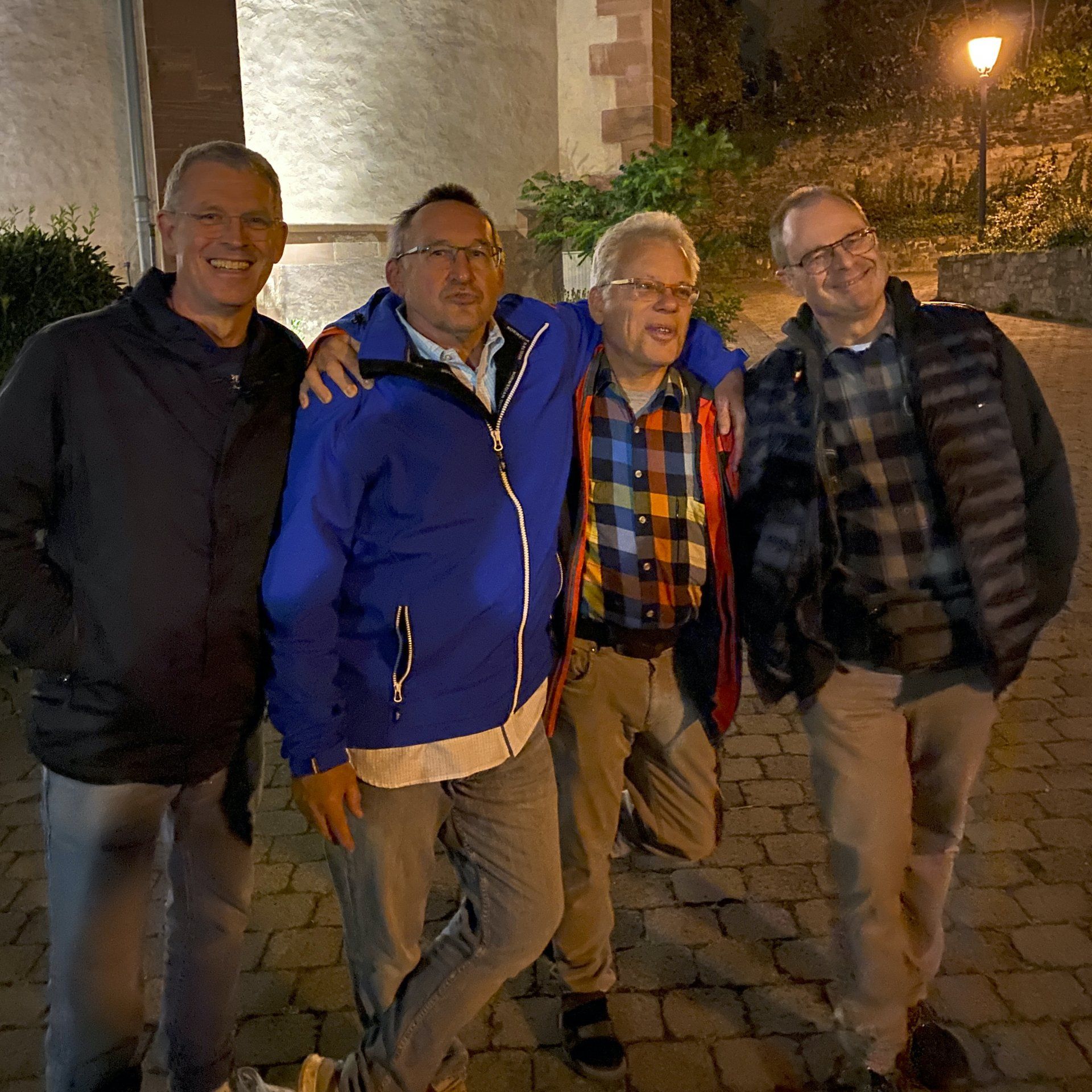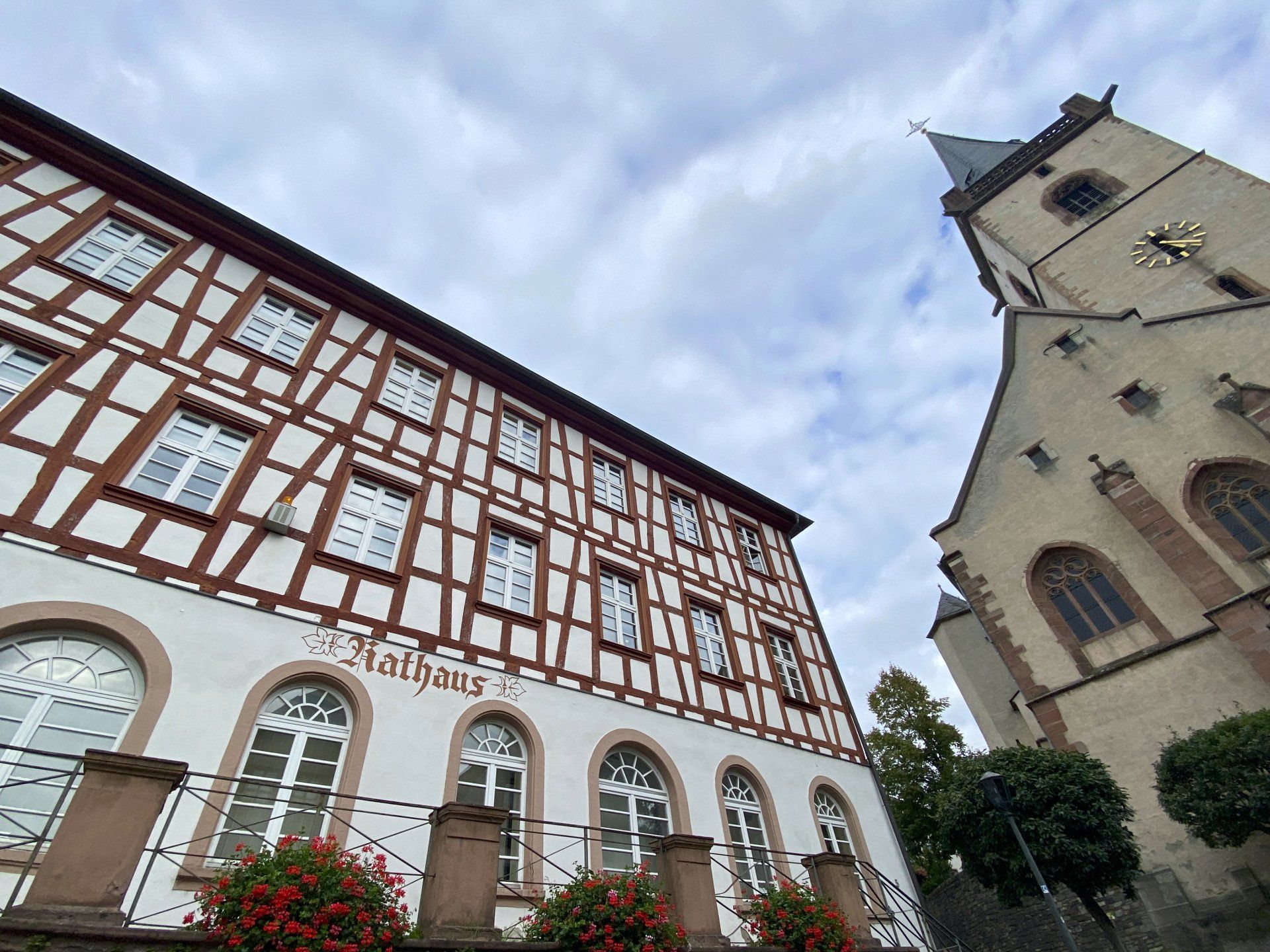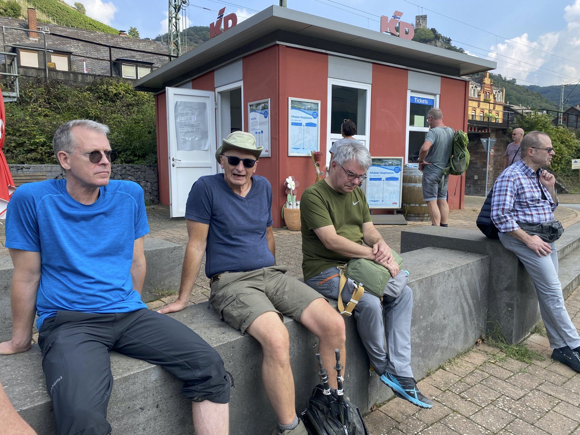 „Hotel im Schulhaus“ im nahe gelegenen Lorch am Rhein, zu treffen. Und zwar – bitteschön – um 16 Uhr. Vielleicht bremste das pfeilschnelle Schlockmobil mit „Seipel, dem Spinner“ himself und seinen von Angstschweiß beträufelten Mitfahrern Dubai-Daum, van Benderchem und dem ab sofort fest in die Truppe integrierten OJJ deshalb erst 50 Minuten zu spät vor dem Hotel – und somit knapp vor Beginn der für den ersten Abend organisierten Führung durch das idyllische Örtchen, das den Herrenwanderern für drei Tage als Homebase diente. Der Wiedehopf war schon Stunden vorher vorbildlich per pedes (auf dem E-Bike) angereist, Bushido und Tourmaster Titte hatten es, mild-hybrid getrieben, von Wiesbaden aus immerhin pünktlich geschafft und bereits ihre Zimmer bezogen. Nach einem schnellen Check-in der „späten Vier“ startete die siebenköpfige Truppe dann zu einem inspirierten Rundgang durch Lorch unter Führung von Herrn Edwin Schneider, der in seinem Heimatort jeden Winkel kennt, pausenlos Bekannte grüßt und die triste Einfallstraße konsequenterweise schnell verließ.