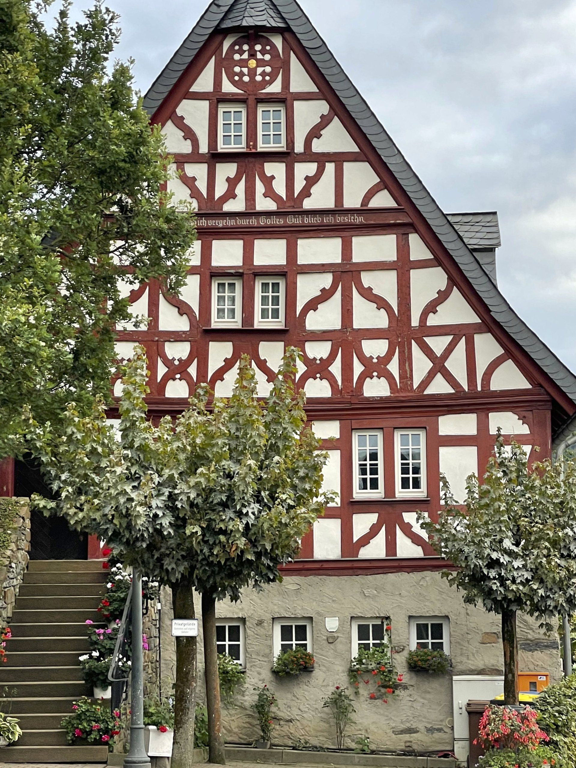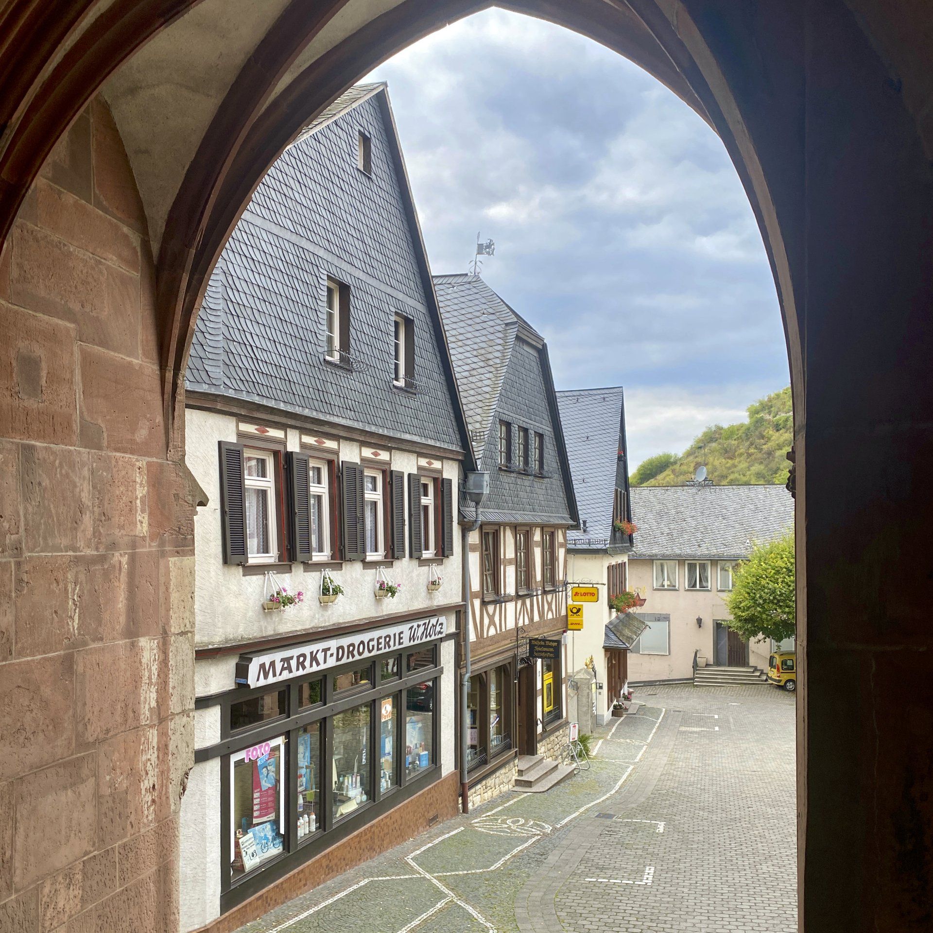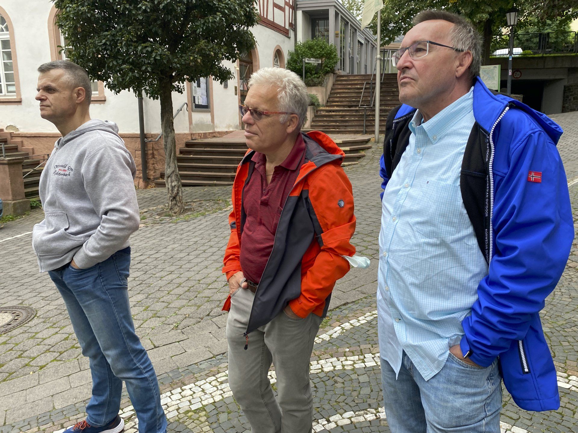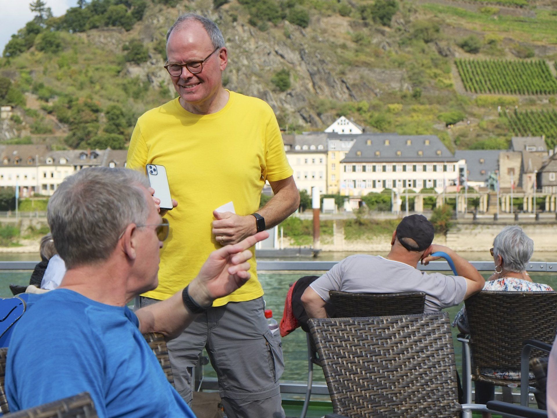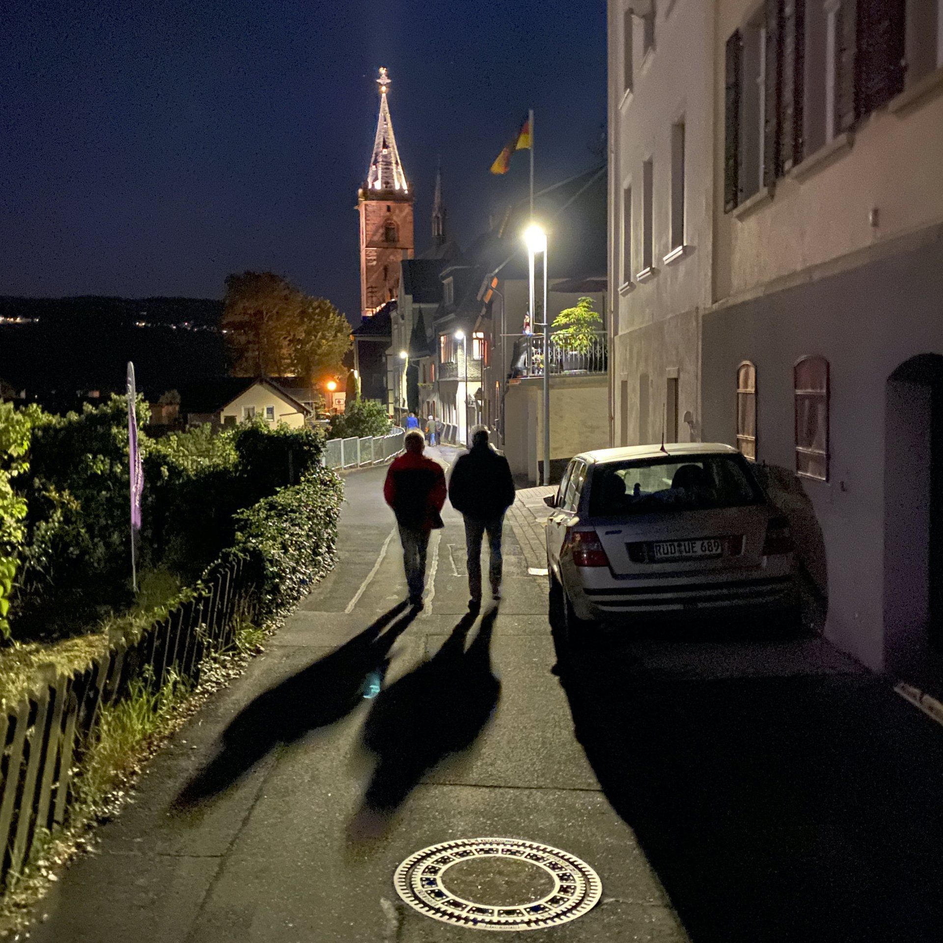 „Hotel im Schulhaus“ im nahe gelegenen Lorch am Rhein, zu treffen. Und zwar – bitteschön – um 16 Uhr. Vielleicht bremste das pfeilschnelle Schlockmobil mit „Seipel, dem Spinner“ himself und seinen von Angstschweiß beträufelten Mitfahrern Dubai-Daum, van Benderchem und dem ab sofort fest in die Truppe integrierten OJJ deshalb erst 50 Minuten zu spät vor dem Hotel – und somit knapp vor Beginn der für den ersten Abend organisierten Führung durch das idyllische Örtchen, das den Herrenwanderern für drei Tage als Homebase diente. Der Wiedehopf war schon Stunden vorher vorbildlich per pedes (auf dem E-Bike) angereist, Bushido und Tourmaster Titte hatten es, mild-hybrid getrieben, von Wiesbaden aus immerhin pünktlich geschafft und bereits ihre Zimmer bezogen. Nach einem schnellen Check-in der „späten Vier“ startete die siebenköpfige Truppe dann zu einem inspirierten Rundgang durch Lorch unter Führung von Herrn Edwin Schneider, der in seinem Heimatort jeden Winkel kennt, pausenlos Bekannte grüßt und die triste Einfallstraße konsequenterweise schnell verließ.