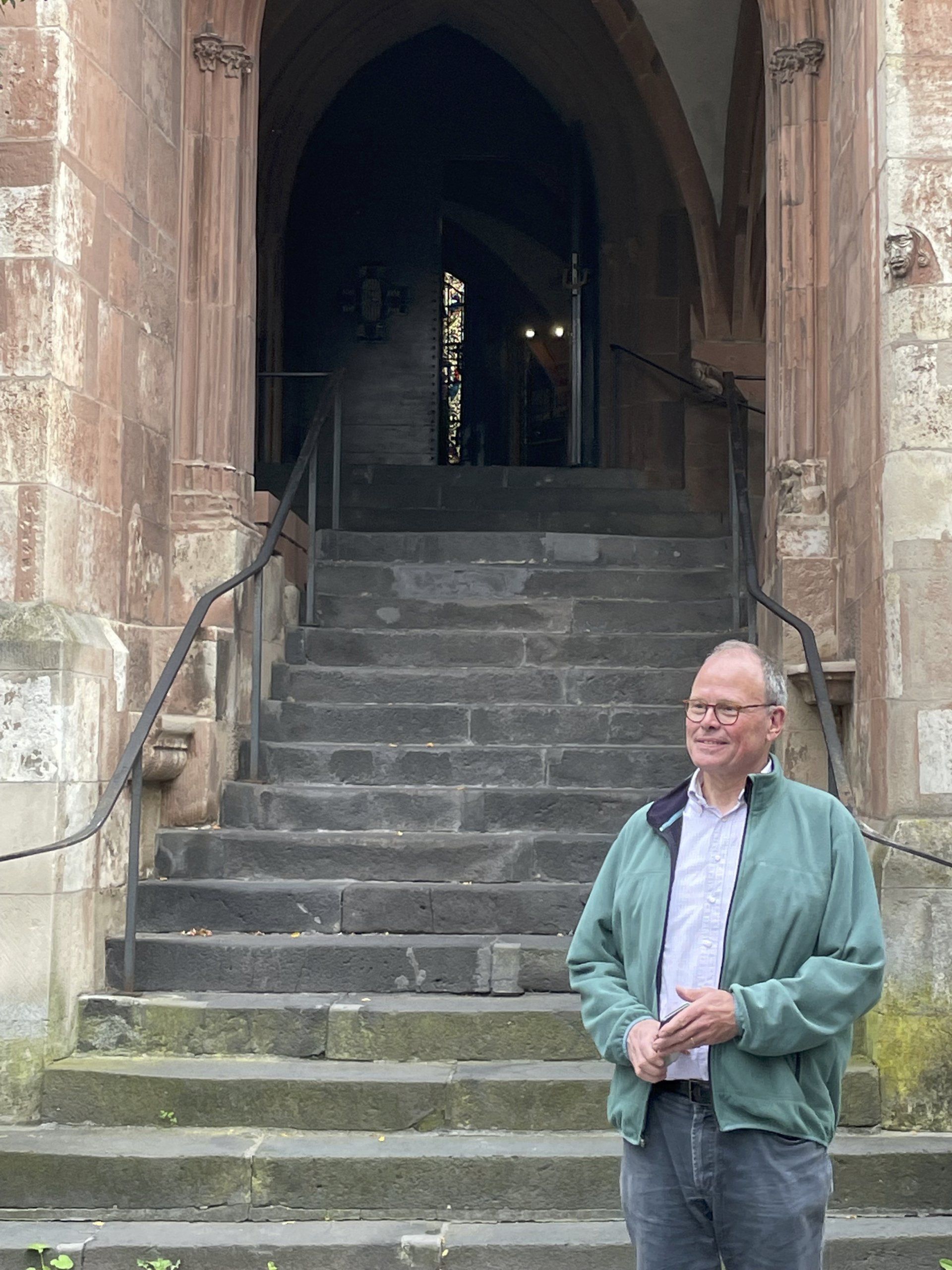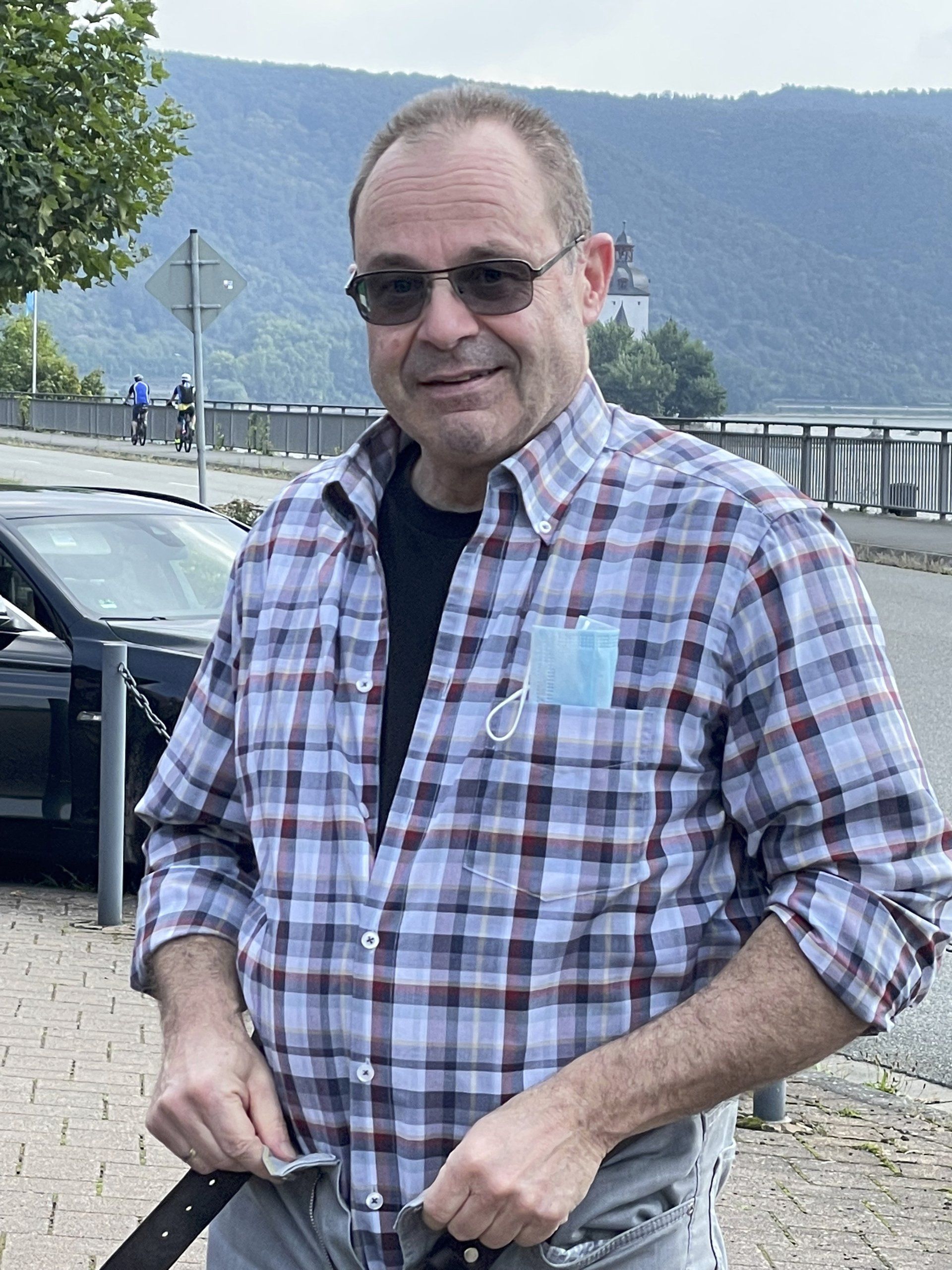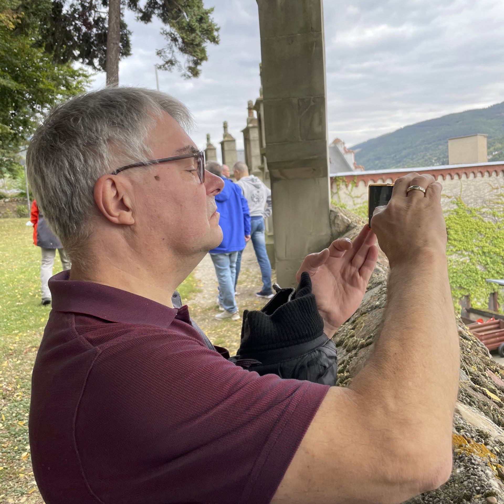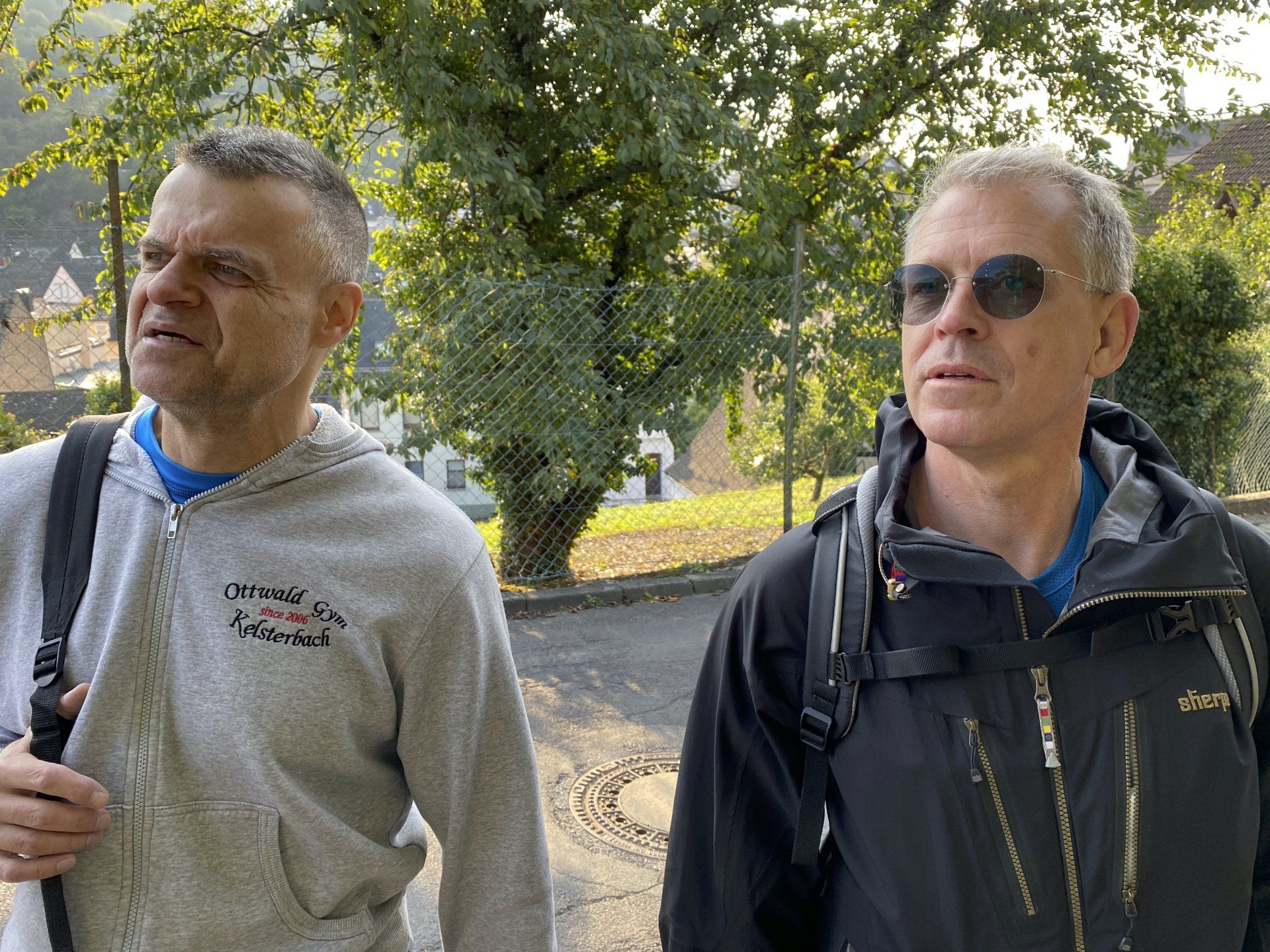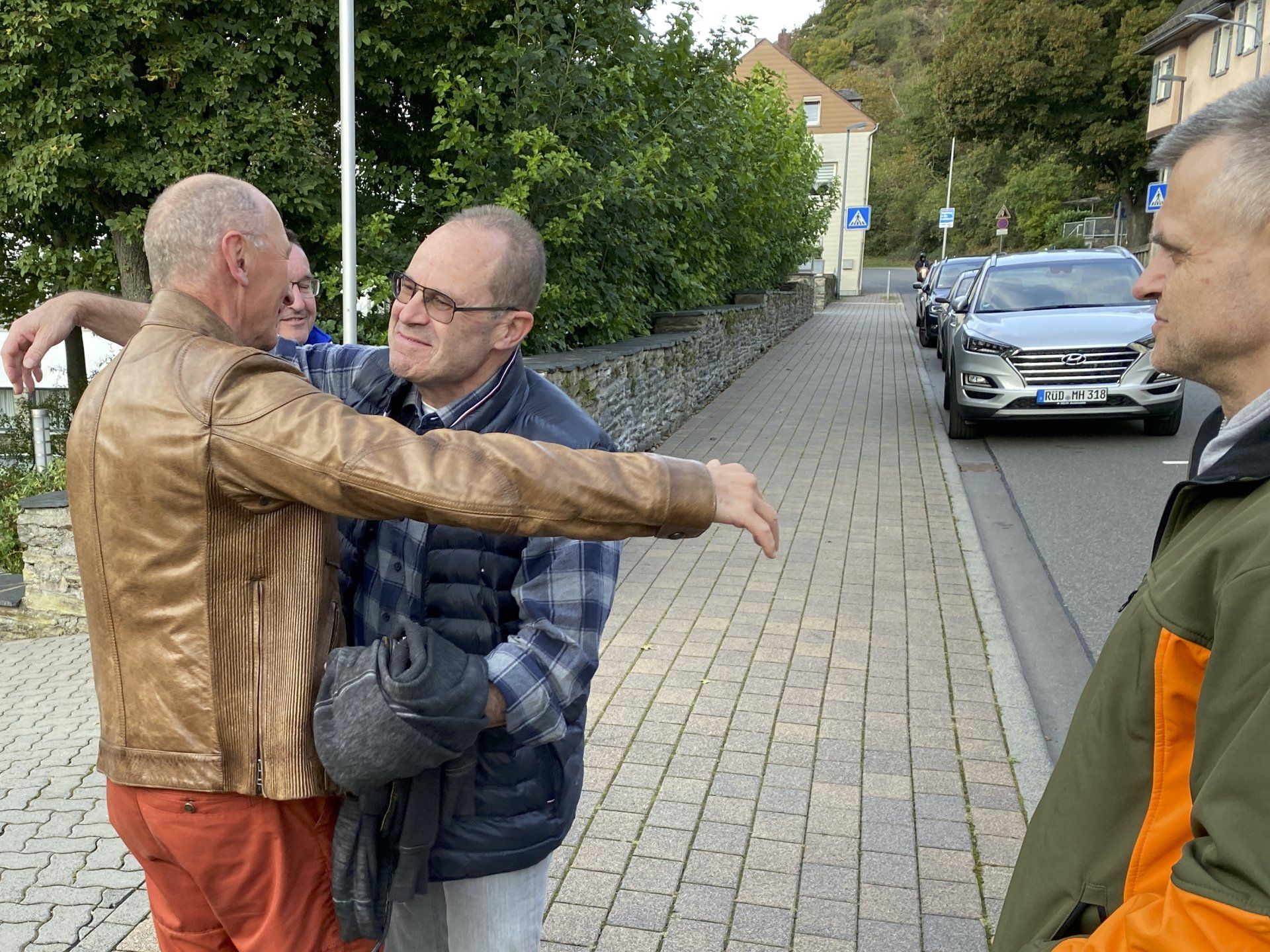 „Hotel im Schulhaus“ im nahe gelegenen Lorch am Rhein, zu treffen. Und zwar – bitteschön – um 16 Uhr. Vielleicht bremste das pfeilschnelle Schlockmobil mit „Seipel, dem Spinner“ himself und seinen von Angstschweiß beträufelten Mitfahrern Dubai-Daum, van Benderchem und dem ab sofort fest in die Truppe integrierten OJJ deshalb erst 50 Minuten zu spät vor dem Hotel – und somit knapp vor Beginn der für den ersten Abend organisierten Führung durch das idyllische Örtchen, das den Herrenwanderern für drei Tage als Homebase diente. Der Wiedehopf war schon Stunden vorher vorbildlich per pedes (auf dem E-Bike) angereist, Bushido und Tourmaster Titte hatten es, mild-hybrid getrieben, von Wiesbaden aus immerhin pünktlich geschafft und bereits ihre Zimmer bezogen. Nach einem schnellen Check-in der „späten Vier“ startete die siebenköpfige Truppe dann zu einem inspirierten Rundgang durch Lorch unter Führung von Herrn Edwin Schneider, der in seinem Heimatort jeden Winkel kennt, pausenlos Bekannte grüßt und die triste Einfallstraße konsequenterweise schnell verließ.