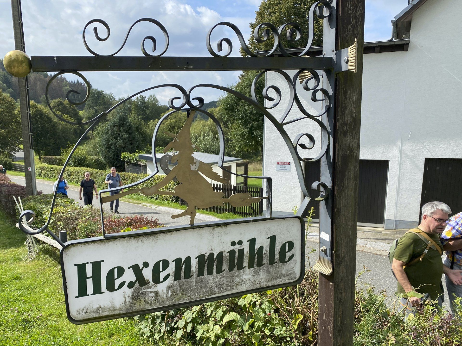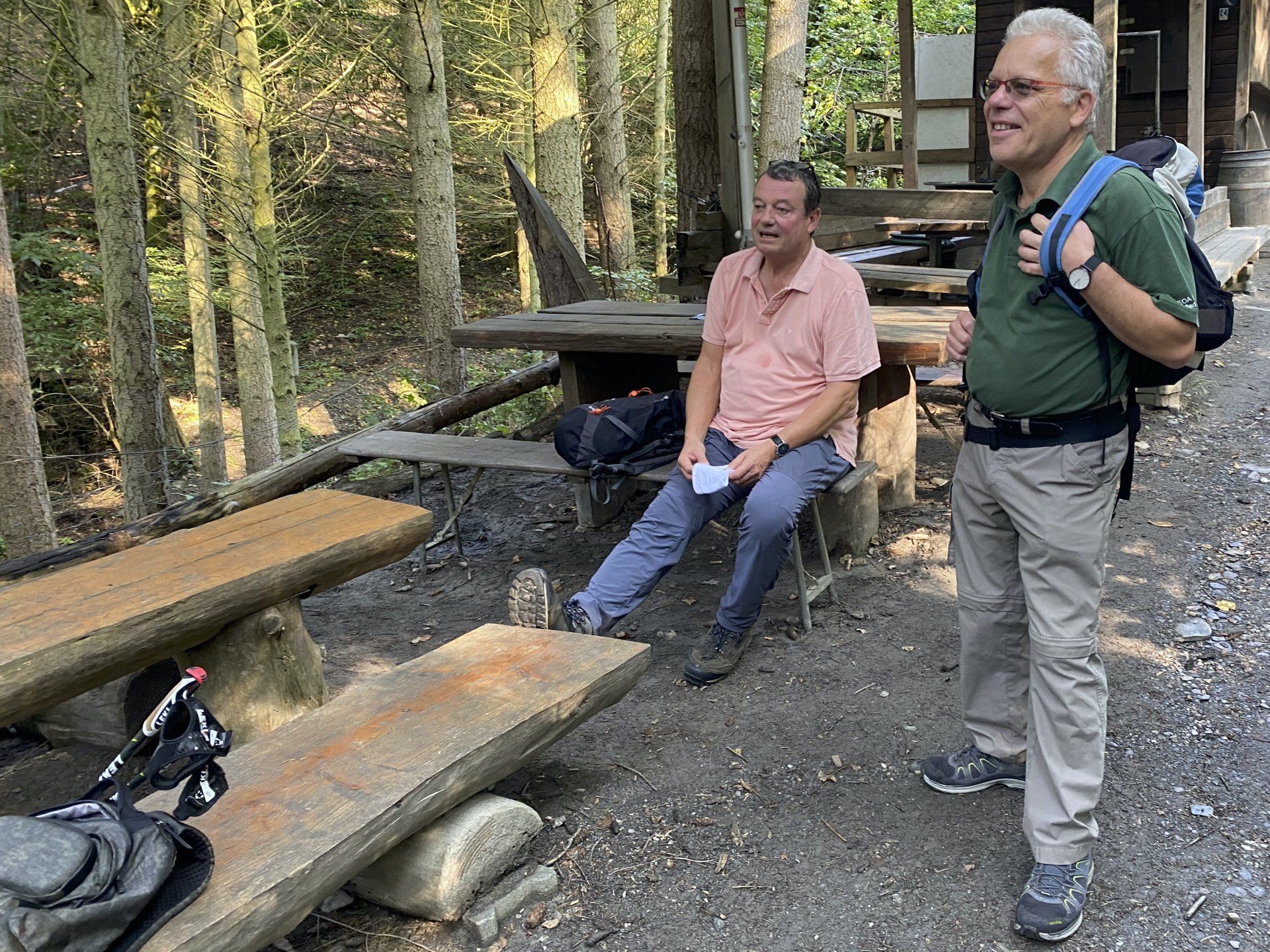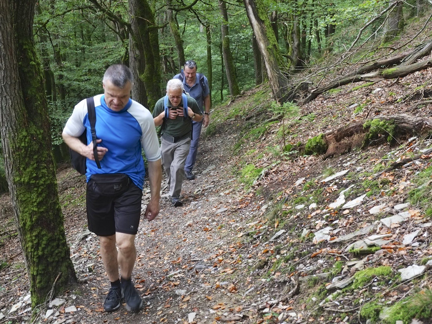 Wispertrails „Naurother Grubengold“ im 30 Minuten entfernten Heidenrod-Nauroth aufbrechen. Kaum vom Wanderparkplatz „Naurother Heide“ aus losgewandert, hatte man sich auch schon zum ersten Mal verlaufen, wurde aber vom Tourmaster anschließend mit App-Unterstützung auf Linie getrimmt. Und so ging es durch Wald, durch viel Wald, aber auch durch viel Flur, vorbei an Schiefergruben, über denen noch bis 1964 ein „Glückauf“ ertönte, hinein ins wildromantische Herzbachtal, das heute Naturschutzgebiet ist. Der Weg war weit – und dem einen oder anderen schmerzten schon die Füße, als endlich der kleine Wispersee in Sicht kam, wo das erste Gruppenfoto der diesjährigen Tour entstand. Von dort aus war es nicht mehr weit zur „Hexenmühle“ in Wisper, einem Lokal mit unerwartet farbenfroher Inneneinrichtung, zumindest im selbstgezimmerten Zelt-Anbau, wo Plüschkissen in Rosa- und Purpletönen im Team mit Hirsch-Repliken unterschiedlichster Couleur für Irritationen, dann aber auch für herzerfrischende Lachsalven sorgten. Und was gab’s zu essen? Frische Wisperforelle natürlich, zumindest für sechs Wanderer. Dubai-Daum hatte seiner täglichen Portion Thunfisch aus der Dose den Vorzug gegeben, um sie anschließend im Magen mit einer Schicht Penne zu bedecken. Gegen 14.30 Uhr traten die Herrenwanderer den Rückweg an, anderthalb Stunden später hatte man die Wanderrunde vollendet und fuhr ins Hotel zurück.
