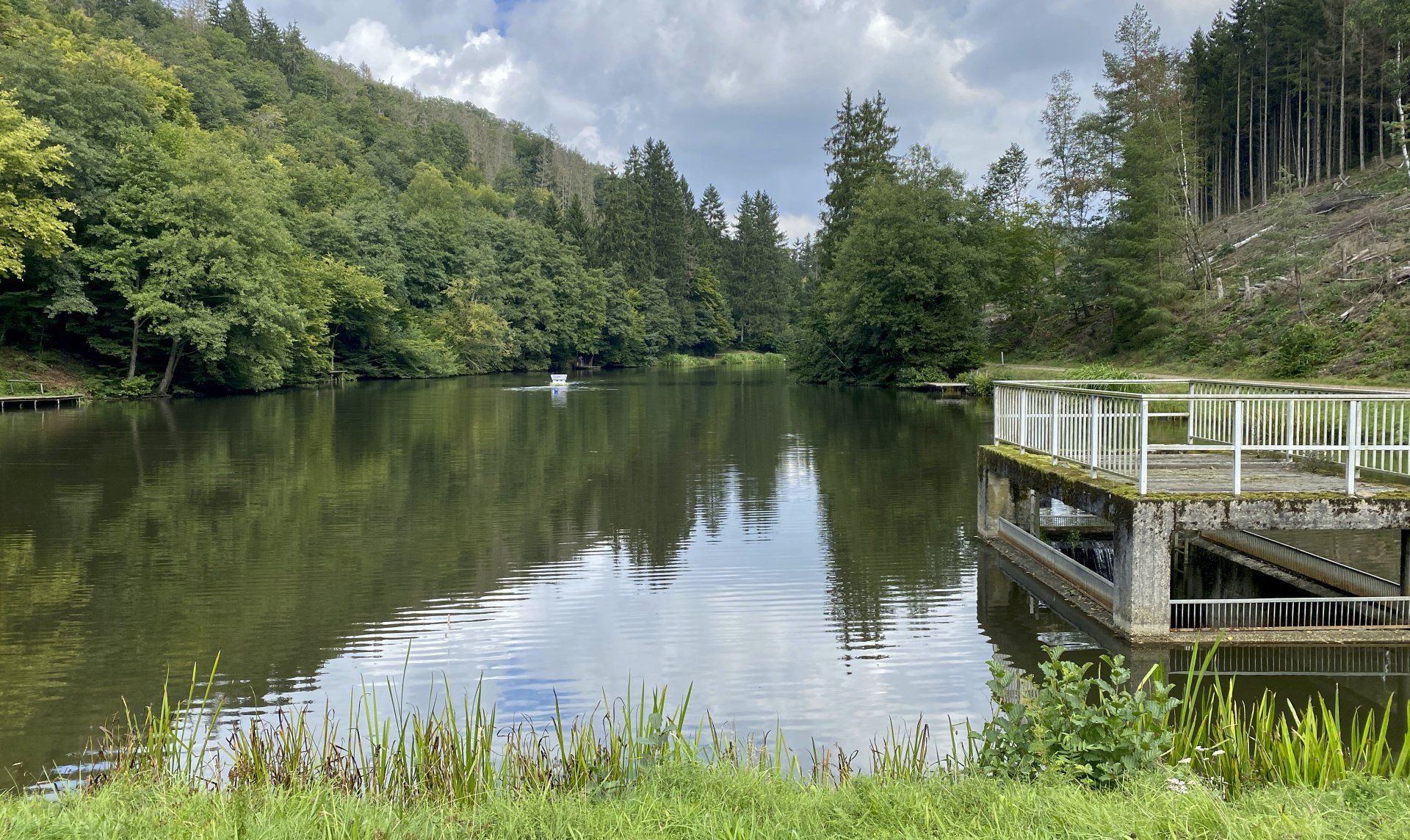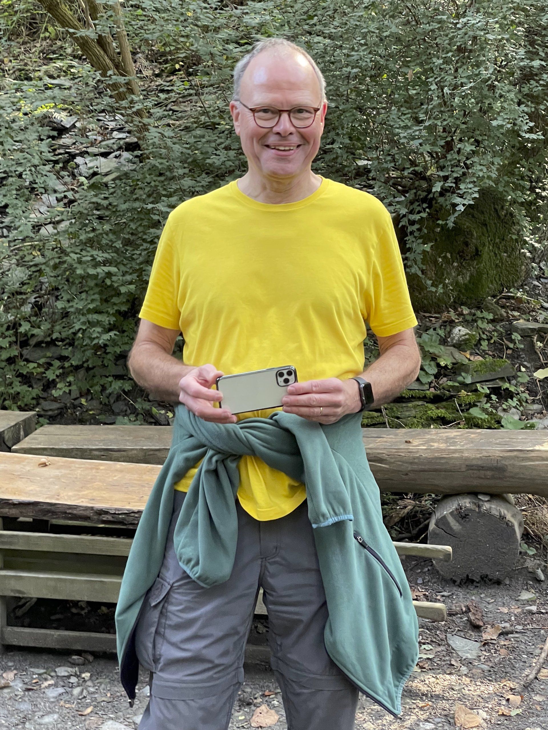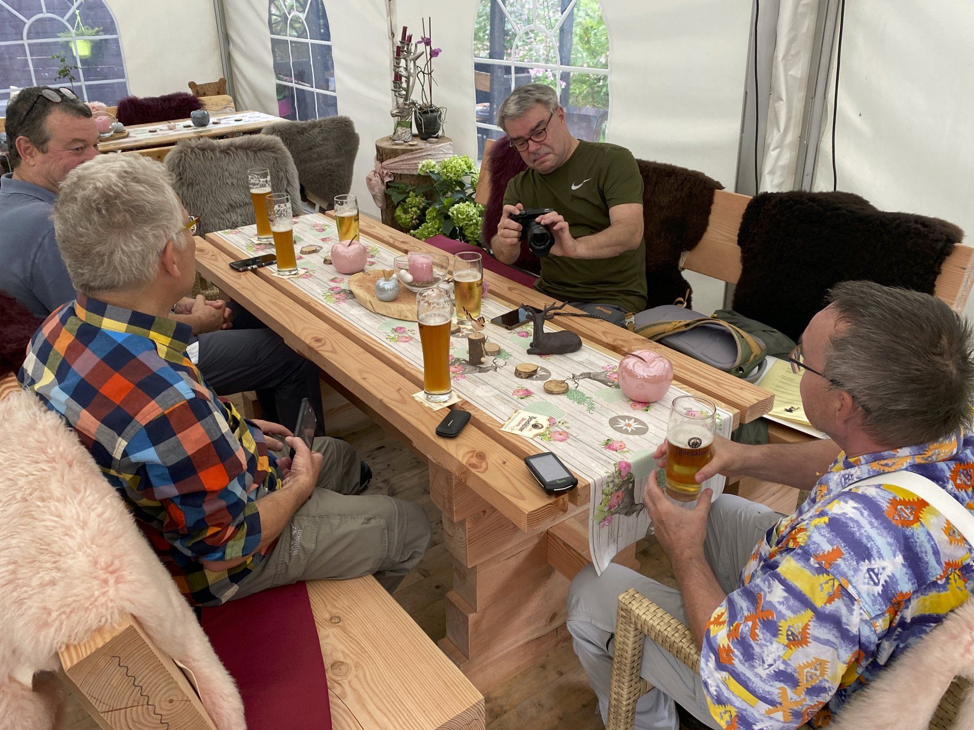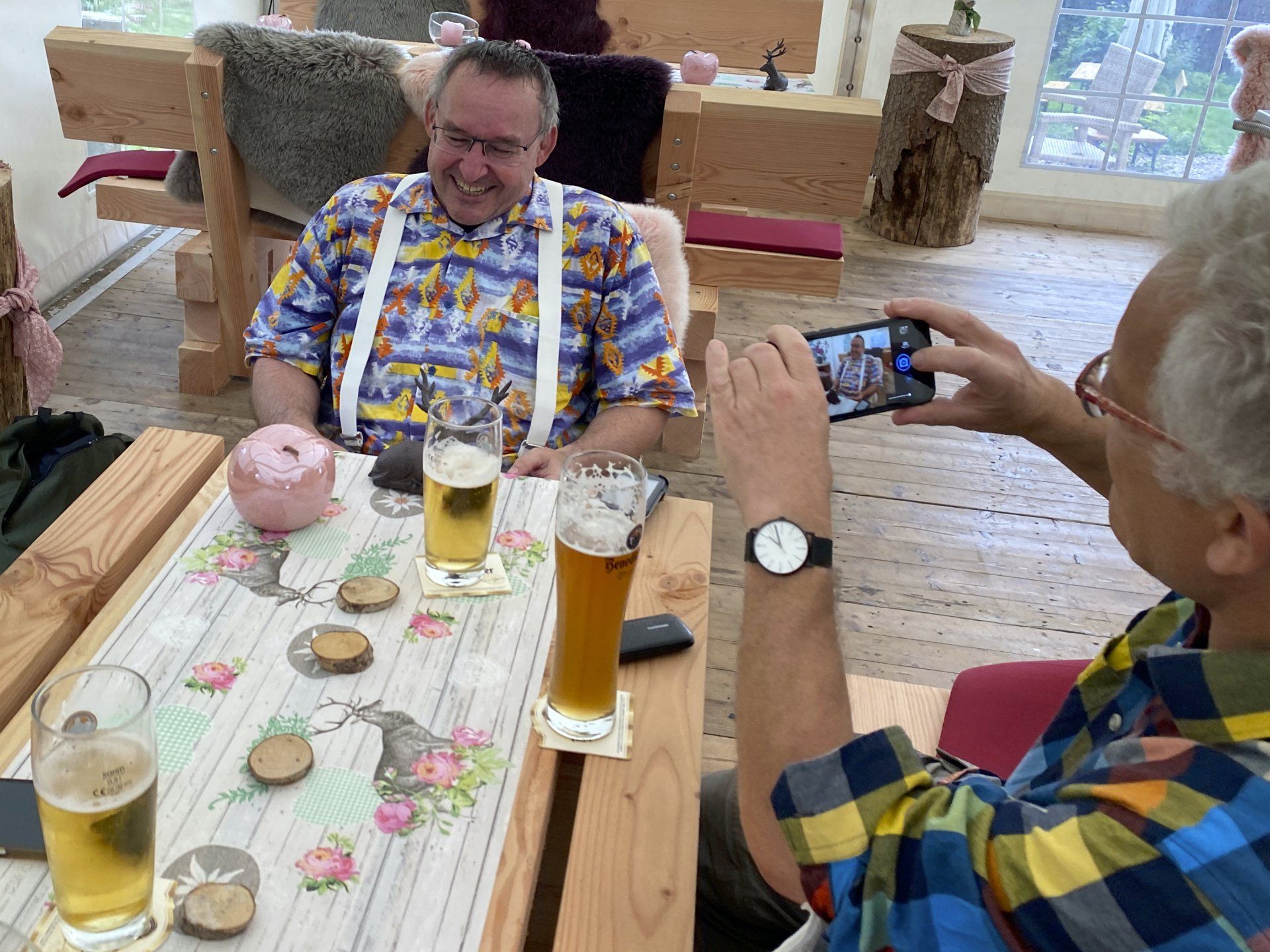 Wispertrails „Naurother Grubengold“ im 30 Minuten entfernten Heidenrod-Nauroth aufbrechen. Kaum vom Wanderparkplatz „Naurother Heide“ aus losgewandert, hatte man sich auch schon zum ersten Mal verlaufen, wurde aber vom Tourmaster anschließend mit App-Unterstützung auf Linie getrimmt. Und so ging es durch Wald, durch viel Wald, aber auch durch viel Flur, vorbei an Schiefergruben, über denen noch bis 1964 ein „Glückauf“ ertönte, hinein ins wildromantische Herzbachtal, das heute Naturschutzgebiet ist. Der Weg war weit – und dem einen oder anderen schmerzten schon die Füße, als endlich der kleine Wispersee in Sicht kam, wo das erste Gruppenfoto der diesjährigen Tour entstand. Von dort aus war es nicht mehr weit zur „Hexenmühle“ in Wisper, einem Lokal mit unerwartet farbenfroher Inneneinrichtung, zumindest im selbstgezimmerten Zelt-Anbau, wo Plüschkissen in Rosa- und Purpletönen im Team mit Hirsch-Repliken unterschiedlichster Couleur für Irritationen, dann aber auch für herzerfrischende Lachsalven sorgten. Und was gab’s zu essen? Frische Wisperforelle natürlich, zumindest für sechs Wanderer. Dubai-Daum hatte seiner täglichen Portion Thunfisch aus der Dose den Vorzug gegeben, um sie anschließend im Magen mit einer Schicht Penne zu bedecken. Gegen 14.30 Uhr traten die Herrenwanderer den Rückweg an, anderthalb Stunden später hatte man die Wanderrunde vollendet und fuhr ins Hotel zurück.