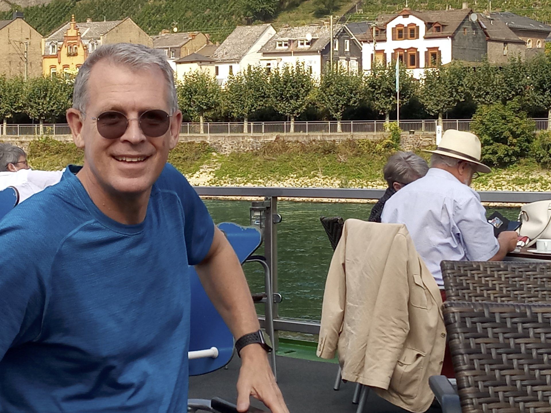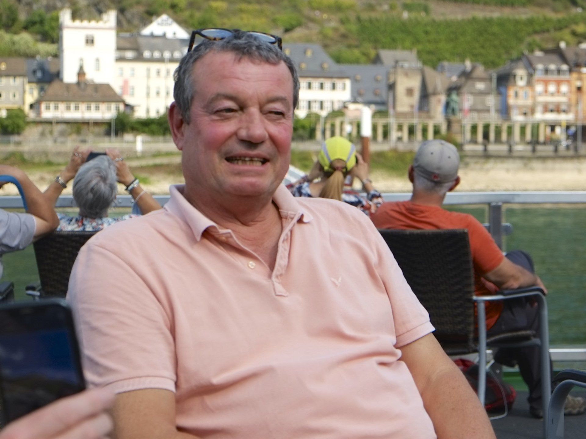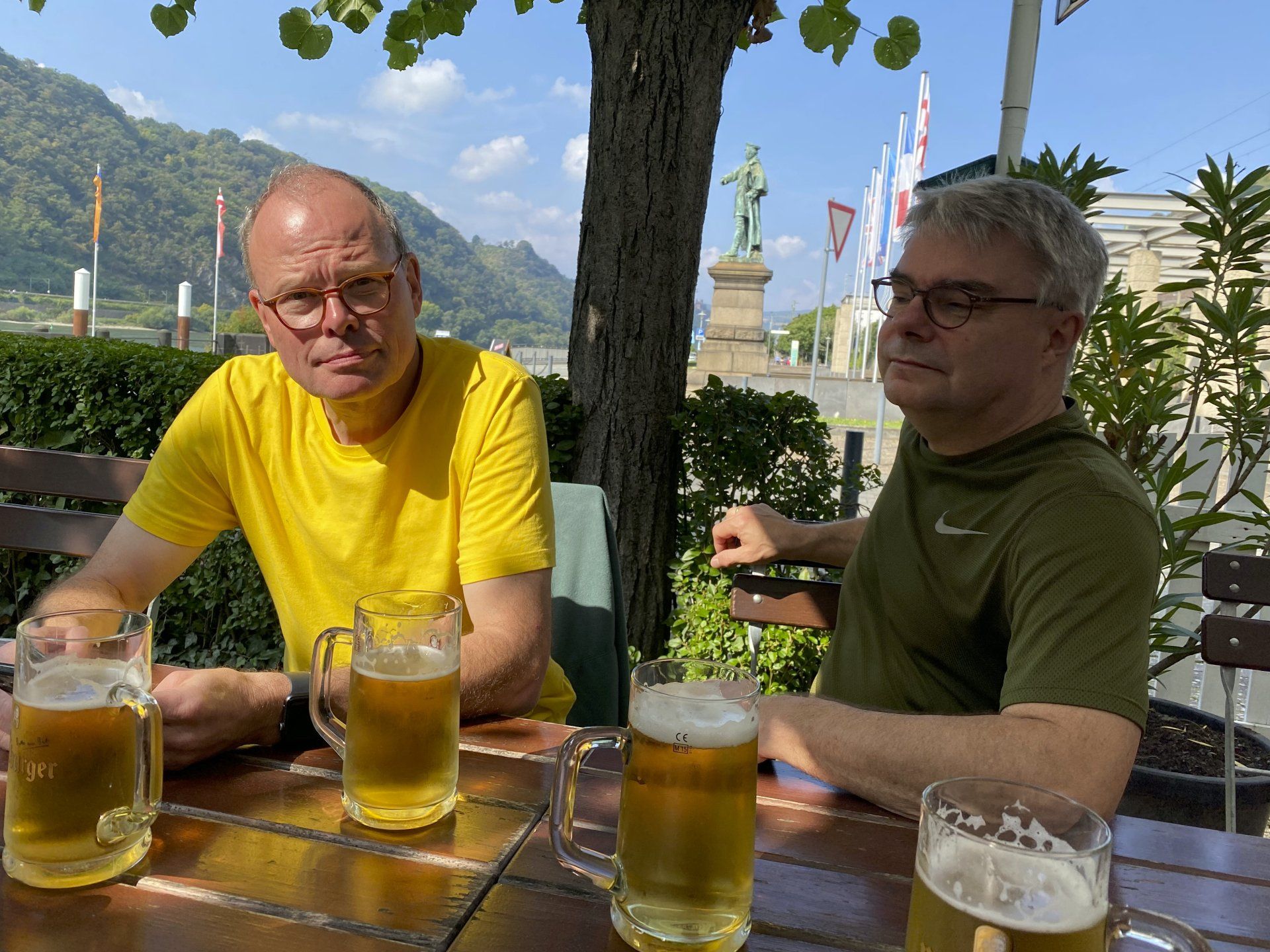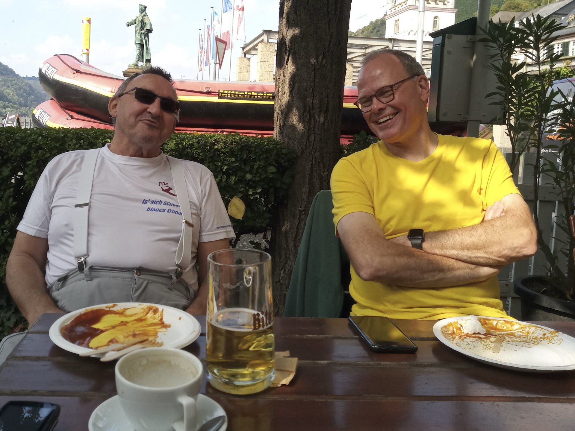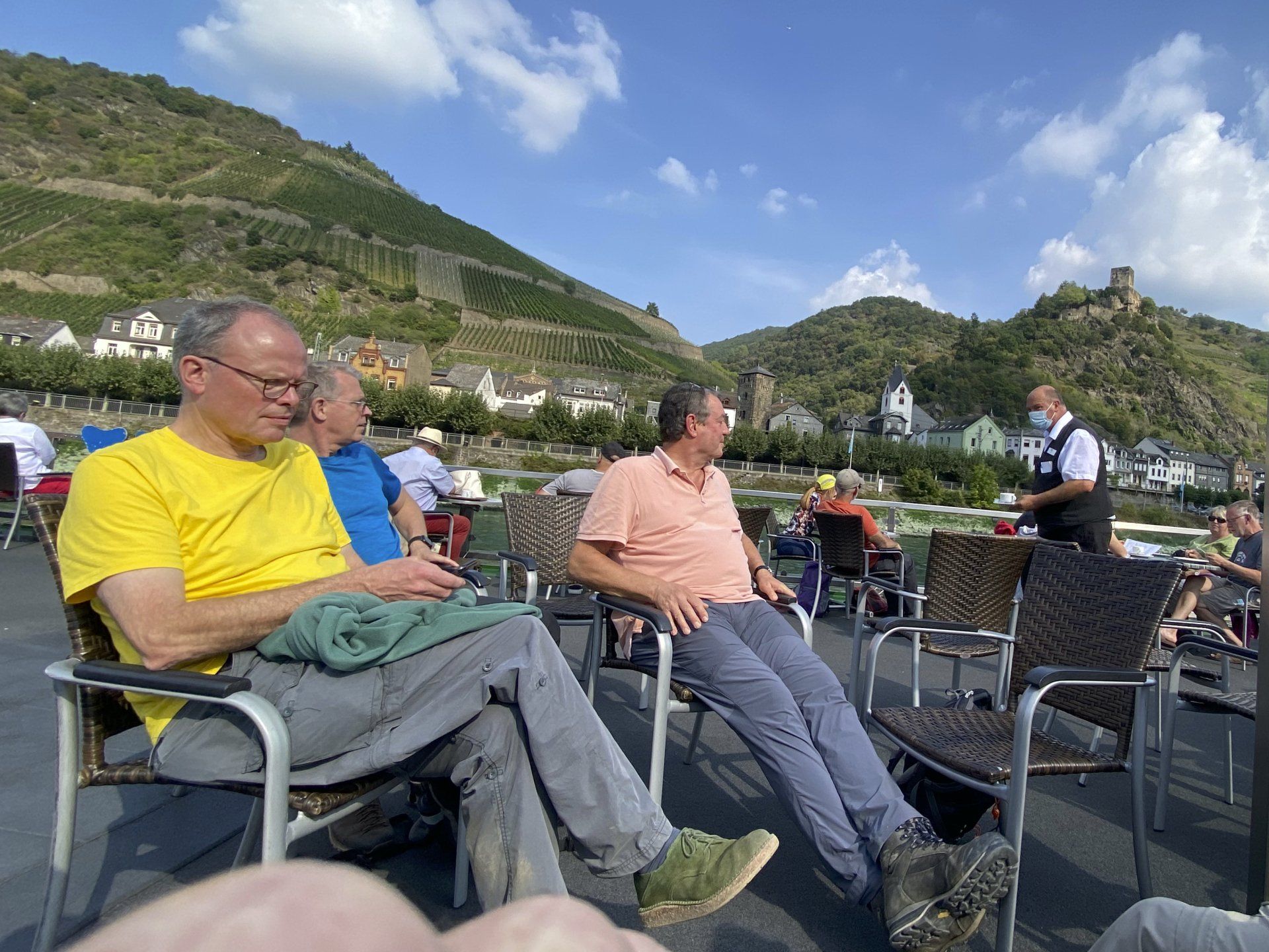 Zeit für den Wurmfortsatz: Gemutmaßt wurde, dass der geduldige Robert möglicherweise für die Bewirtung verantwortlich sei. Zum Glück wurde man schnell eines Besseren belehrt: Auf dem Quad kam Claudia, die gute Fee der Hütte, herangeknattert, hatte dann aber nur Getränke und ein paar Grillwürste anzubieten. So löschten die Wanderer nur mit Radler (sic!) den Durst und sparten sich den Hunger für die Ankunft in Kaub auf (Ausnahme: Thunfischdosen-Daum, der – wie immer – pünktlich nährstoffreiche Nahrung zuführte). Schon kurz vor 13 Uhr war Kaub erreicht – ein Ort, wo niemand abgemalt sein möchte. Immerhin: einen Biergarten gab’s, direkt am Pegelhaus. Dort füllte man die knurrenden Mägen mit Pommes und Currywurst, wanderte anschließend ganz in Ruhe zum Anleger der Köln-Düsseldorfer, erwarb Tickets im Kartenhäuschen und enterte kurz nach 14.30 Uhr die „Godesburg“, um damit auf dem Rhein wieder zurück nach Lorch zu schippern. Jetzt war reichlich Zeit zum Ruhen, bevor es – Stunden später – zunächst erneut ins Weingut Rößler ging, wo die Herren bereits am Vorabend gesoffen hatten. Dort nahm man im Kollektiv binnen anderthalb Stunden zwei Flammkuchen sowie drei Flaschen Wein und mehrere Flaschen Wasser zu sich (Joe wäre sogar bereit gewesen, für eine 8,50 Euro teure Flasche Regent aus dem Hause Rößler ohne mit der Wimper zu zucken 58 Euro zu zahlen) und wechselte dann ins Weingut Germersheimer, wo ein Thai in der Küche steht und so gut wie keine Probleme damit hat, zwei Philosophien (nämlich die thailändische und die deutsche) zu einer schmackhaften lukullischen Welt zu verbinden. So wurde auch der dritte, diesmal wurmfreie Abend zu einem gruppendynamischen Erlebnis von Bacchus’ Gnaden – ein mustergültiges Beispiel für Harmonie unter Freunden. Völlig zufrieden (und abgefüllt) ließen später alle Teilnehmer ihre Häupter in die Kissen sinken.