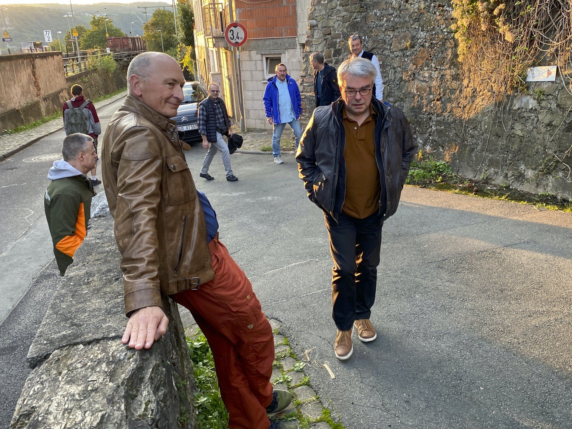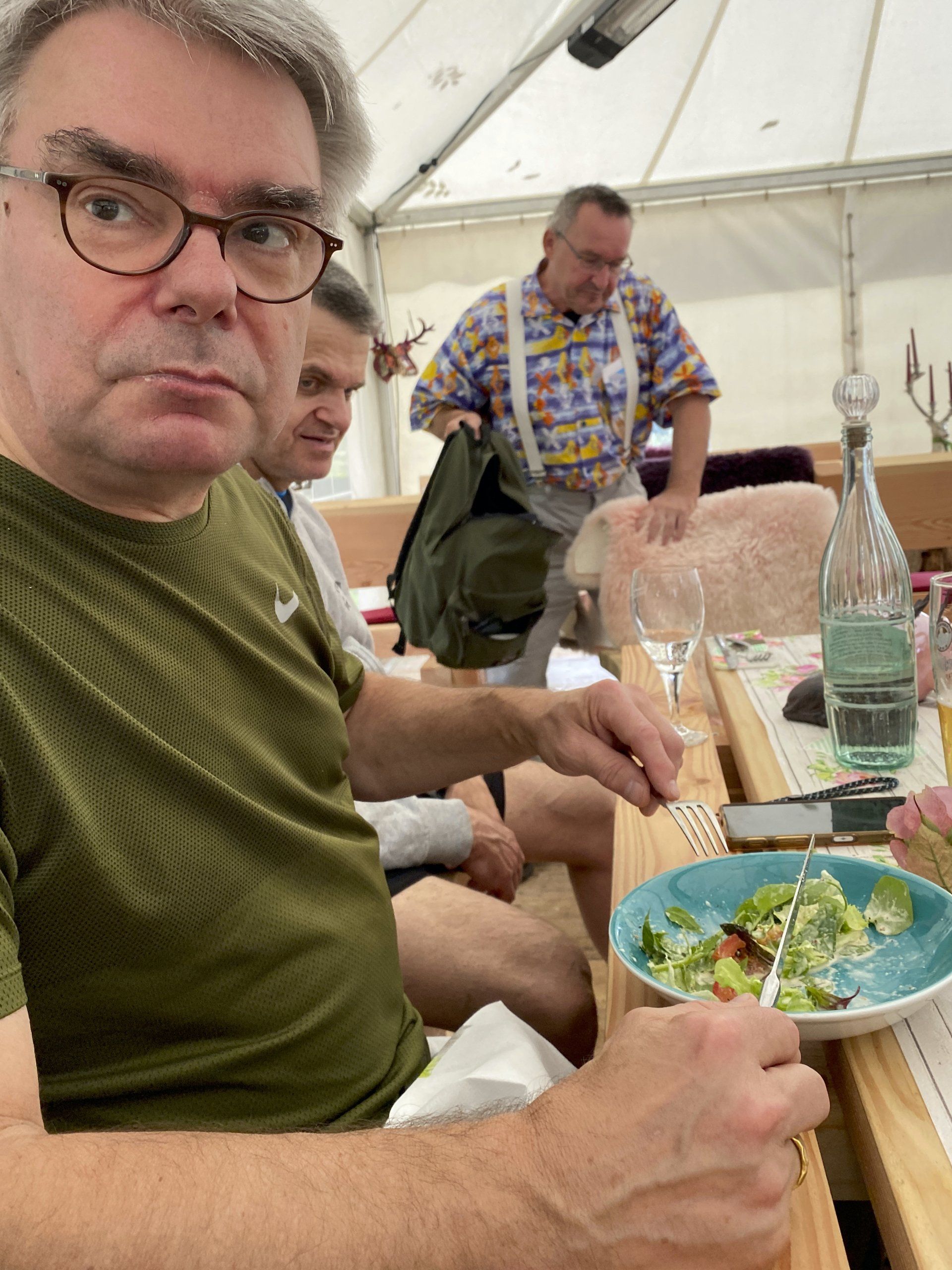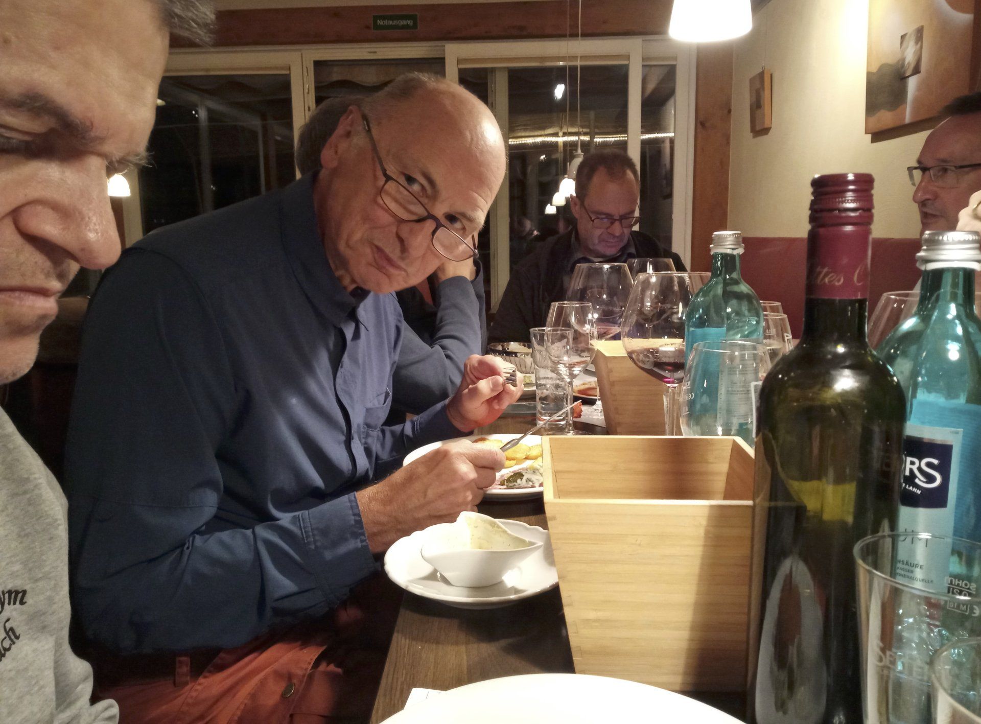 Dort kurze Siesta, die freilich schon bald durch eine bekannte sonore Stimme untermalt wurde: Es ertönte das Wippische Vokalorgan, wie immer sinnierend über die Welt und natürlich im Sensurround-Sound. Aber ausnahmslos alle, auch Joes Freund Penninger, waren froh, den mittlerweile pensionierten Richter aus Rödermark mit einem Tag Verspätung endlich in ihrer Mitte zu wissen. Um 18.40 Uhr versammelte sich die Truppe vor dem Hotel, als Unglaubliches geschah: Ein stahlblauer BMW mit dezenten roten Mantastreifen fuhr vor – und aus dem Innenraum grüßte … der General! Wahrlich, er war es, da gab es kein Vertun. Verdutzte Gesichter durch die Bank weg (vielleicht mit Ausnahme des Tourmaster-Konterfeis, da dieser den Deal schon vor Wochen eingefädelt hatte). So war man plötzlich wieder zu neunt – und wenn man Penninger dazuzählt, war sogar die Truppenstärke von einst wieder erreicht, freilich nur zahlenmäßig, denn zumindest eine Lücke lässt sich leider nie mehr schließen. Verblüfft, aber von Wiedersehensfreude gezeichnet, machten sich alle Neune auf zu einem Ort, der zur Bühne einer der geschichtsträchtigsten Abende in den Annalen der Herrenwanderer werden sollte.
