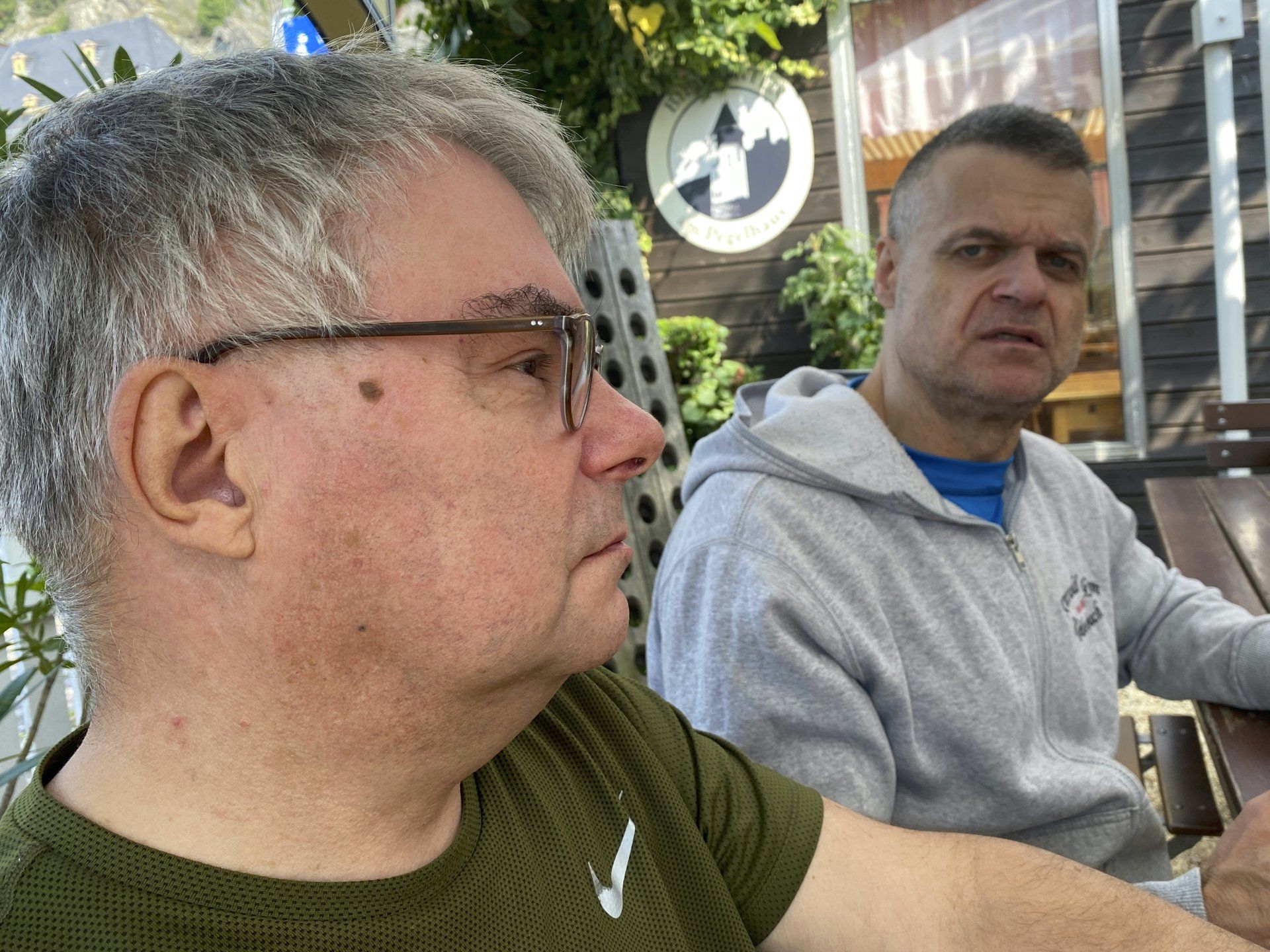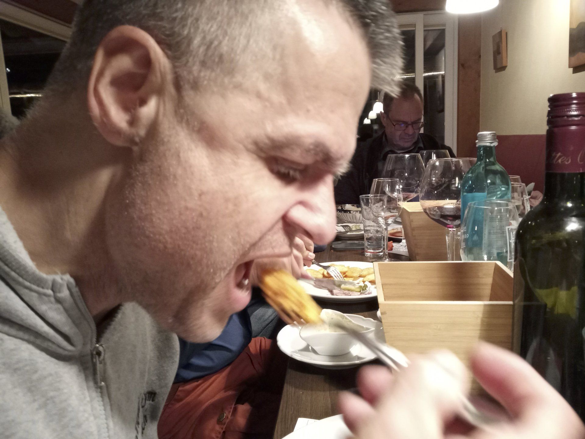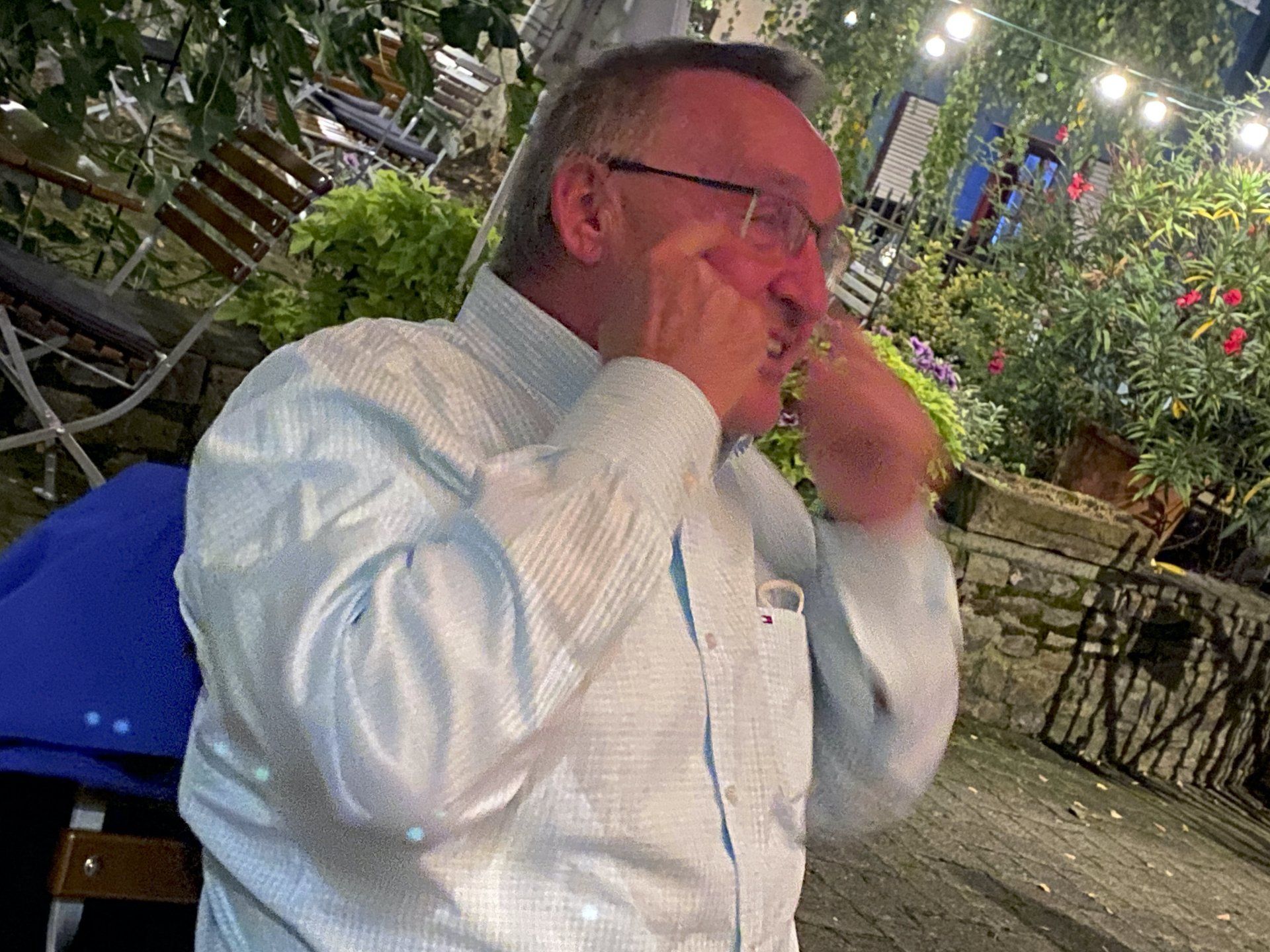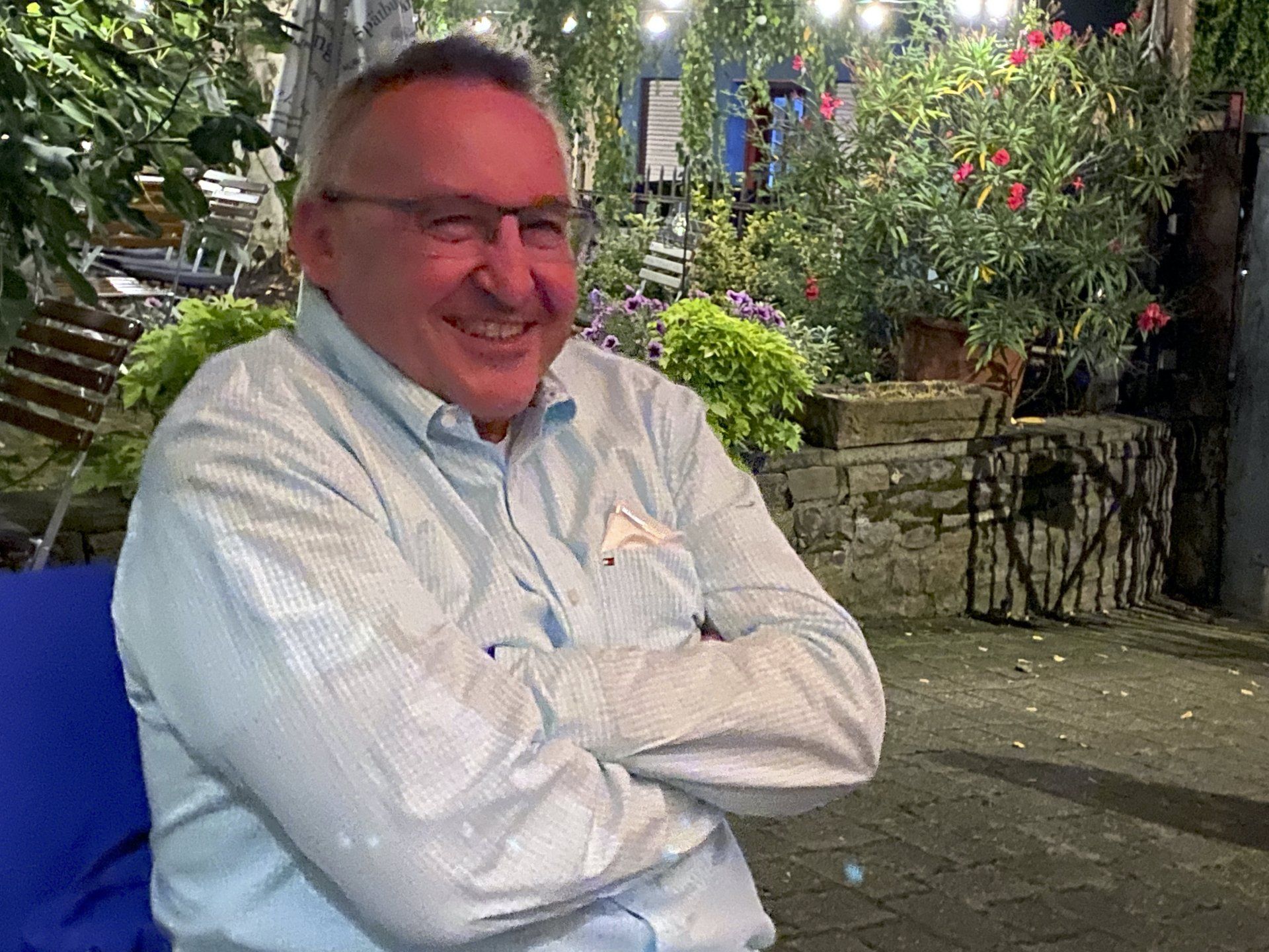 Dort kurze Siesta, die freilich schon bald durch eine bekannte sonore Stimme untermalt wurde: Es ertönte das Wippische Vokalorgan, wie immer sinnierend über die Welt und natürlich im Sensurround-Sound. Aber ausnahmslos alle, auch Joes Freund Penninger, waren froh, den mittlerweile pensionierten Richter aus Rödermark mit einem Tag Verspätung endlich in ihrer Mitte zu wissen. Um 18.40 Uhr versammelte sich die Truppe vor dem Hotel, als Unglaubliches geschah: Ein stahlblauer BMW mit dezenten roten Mantastreifen fuhr vor – und aus dem Innenraum grüßte … der General! Wahrlich, er war es, da gab es kein Vertun. Verdutzte Gesichter durch die Bank weg (vielleicht mit Ausnahme des Tourmaster-Konterfeis, da dieser den Deal schon vor Wochen eingefädelt hatte). So war man plötzlich wieder zu neunt – und wenn man Penninger dazuzählt, war sogar die Truppenstärke von einst wieder erreicht, freilich nur zahlenmäßig, denn zumindest eine Lücke lässt sich leider nie mehr schließen. Verblüfft, aber von Wiedersehensfreude gezeichnet, machten sich alle Neune auf zu einem Ort, der zur Bühne einer der geschichtsträchtigsten Abende in den Annalen der Herrenwanderer werden sollte.