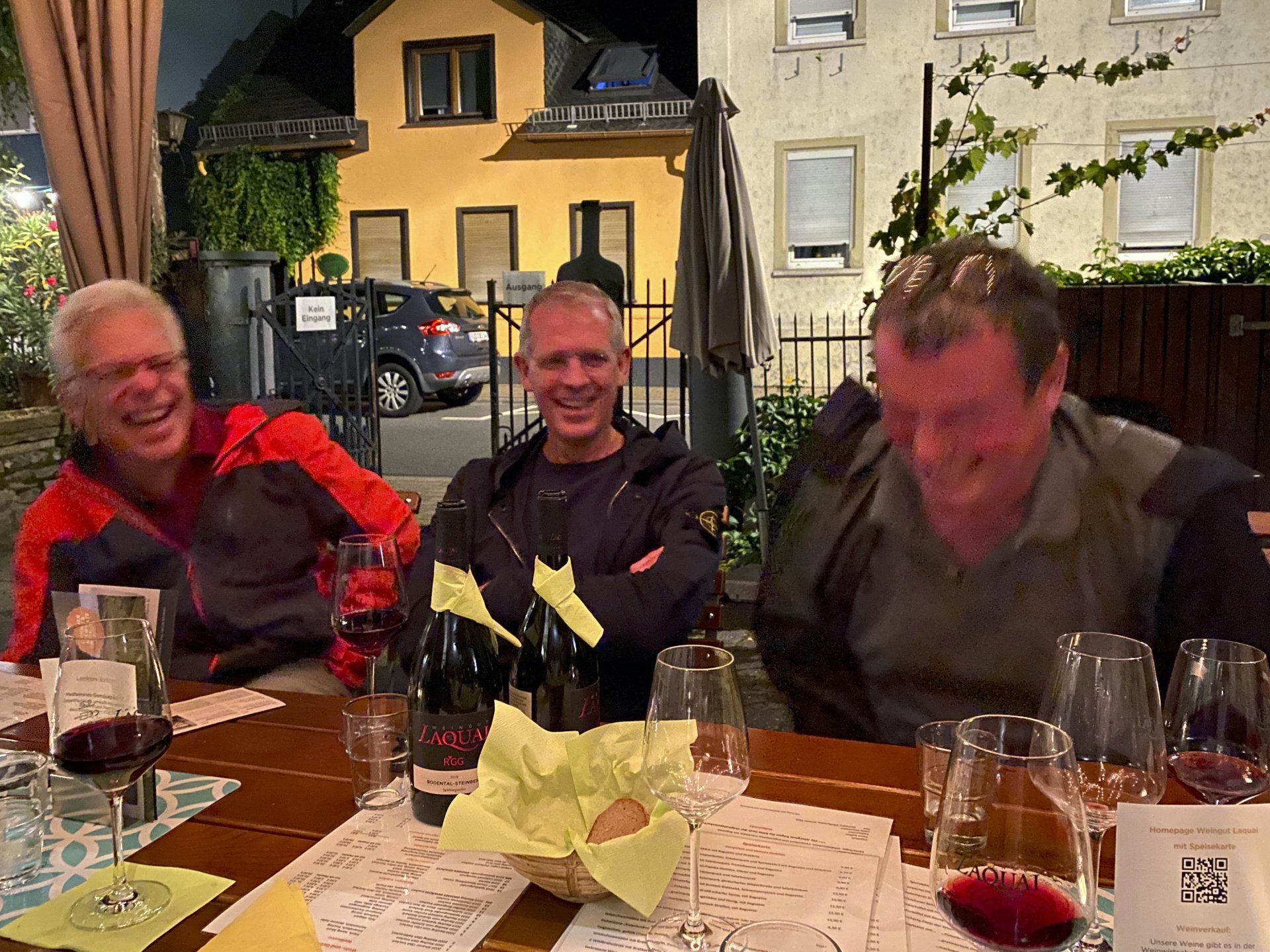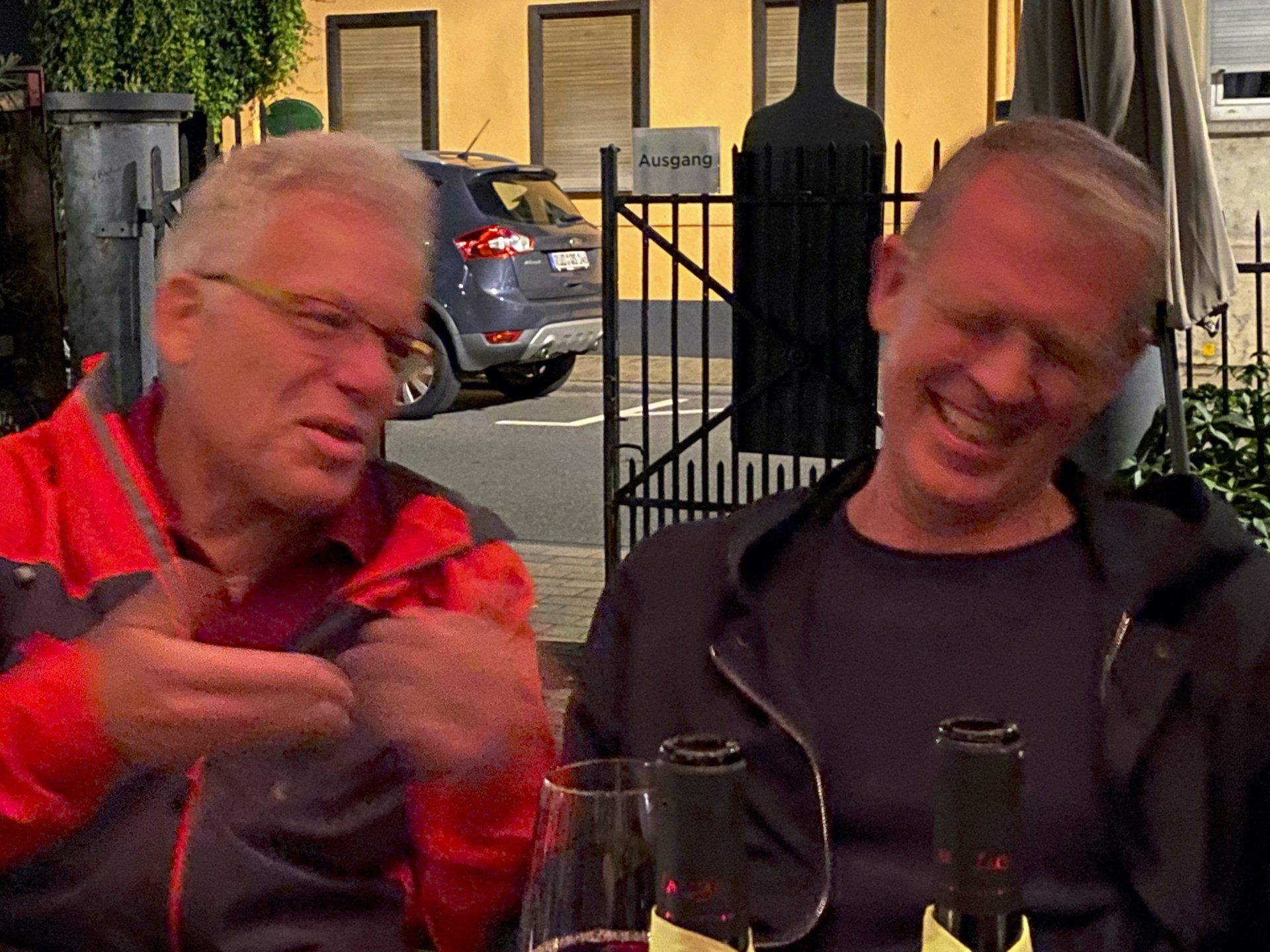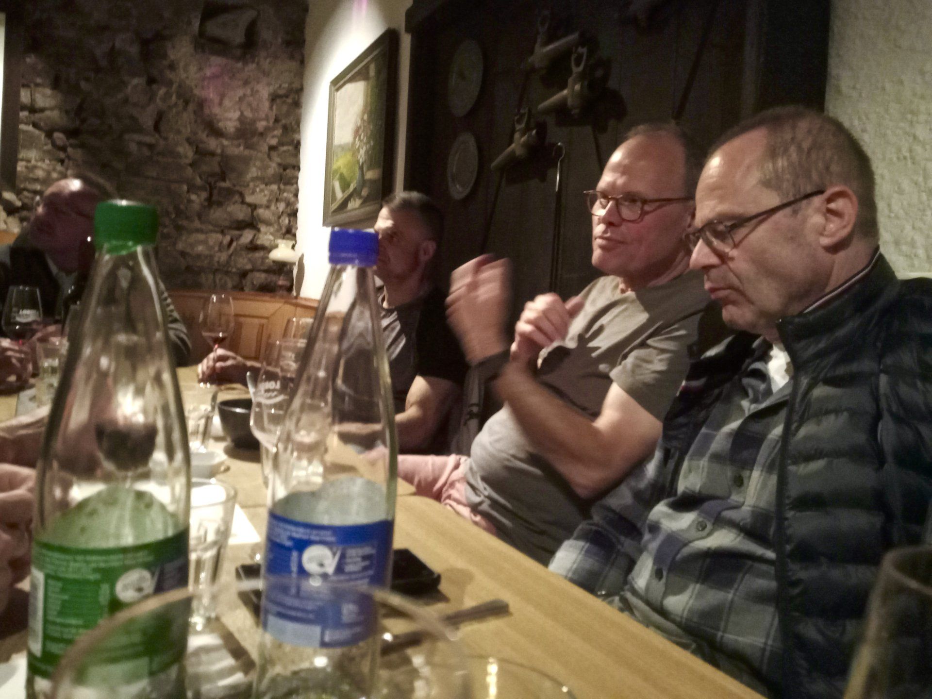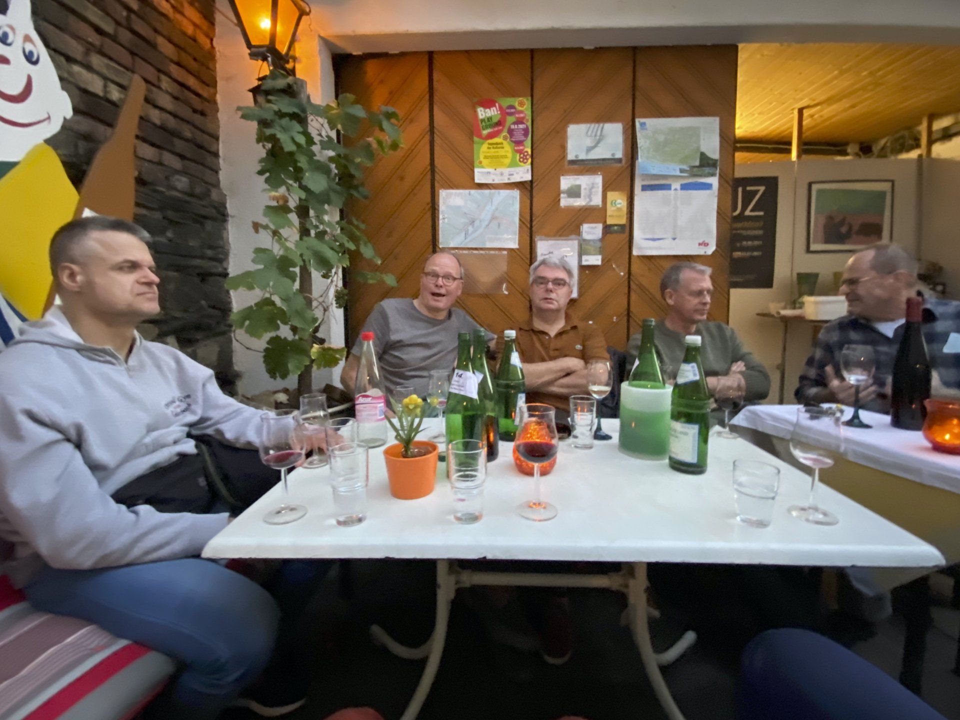 Weinwirtschaft Laquai ab, wo man im lauschigen Außenbereich Platz nahm und – nach leicht zurückhaltendem Start – dank Zuführung schmackhafter Nahrung sowie bereitwilliger Leerung mehrerer Flaschen Spätburgunder – zu ganz großer Form auflief. Beschwingt und leicht benebelt strebte man dann den blitzsauberen Hotelbetten entgegen – in froher Erwartung des ersten Wandertags.