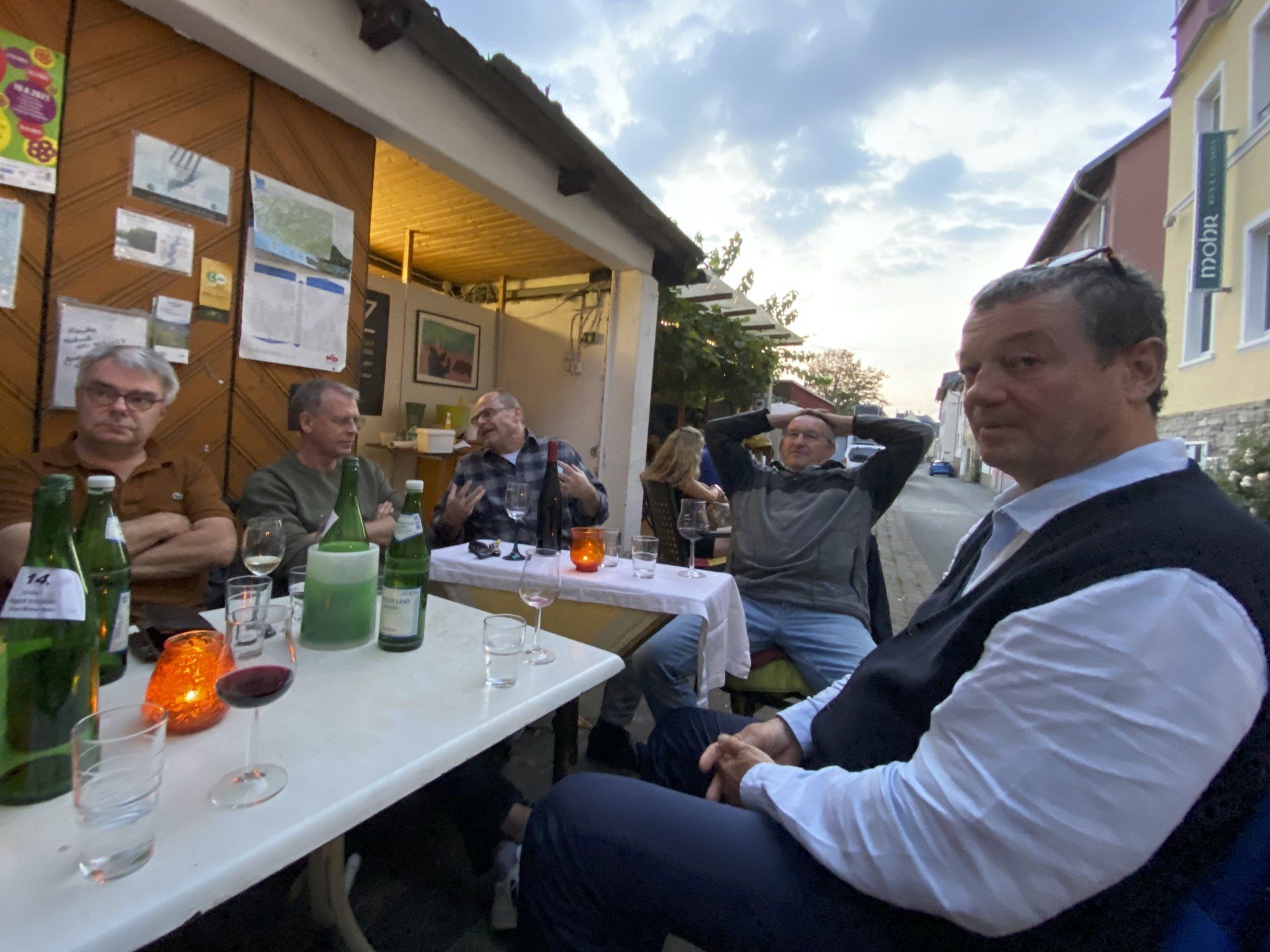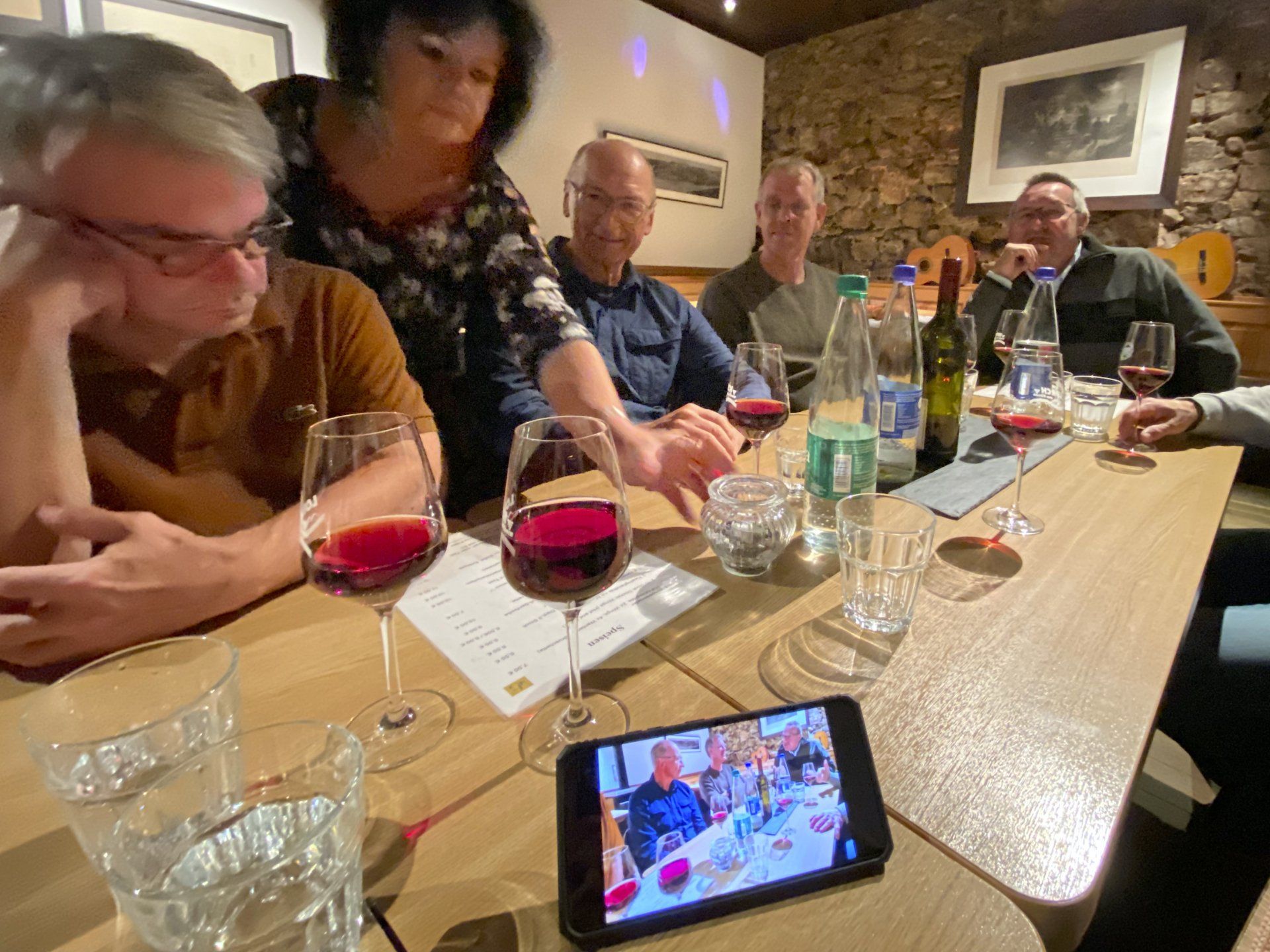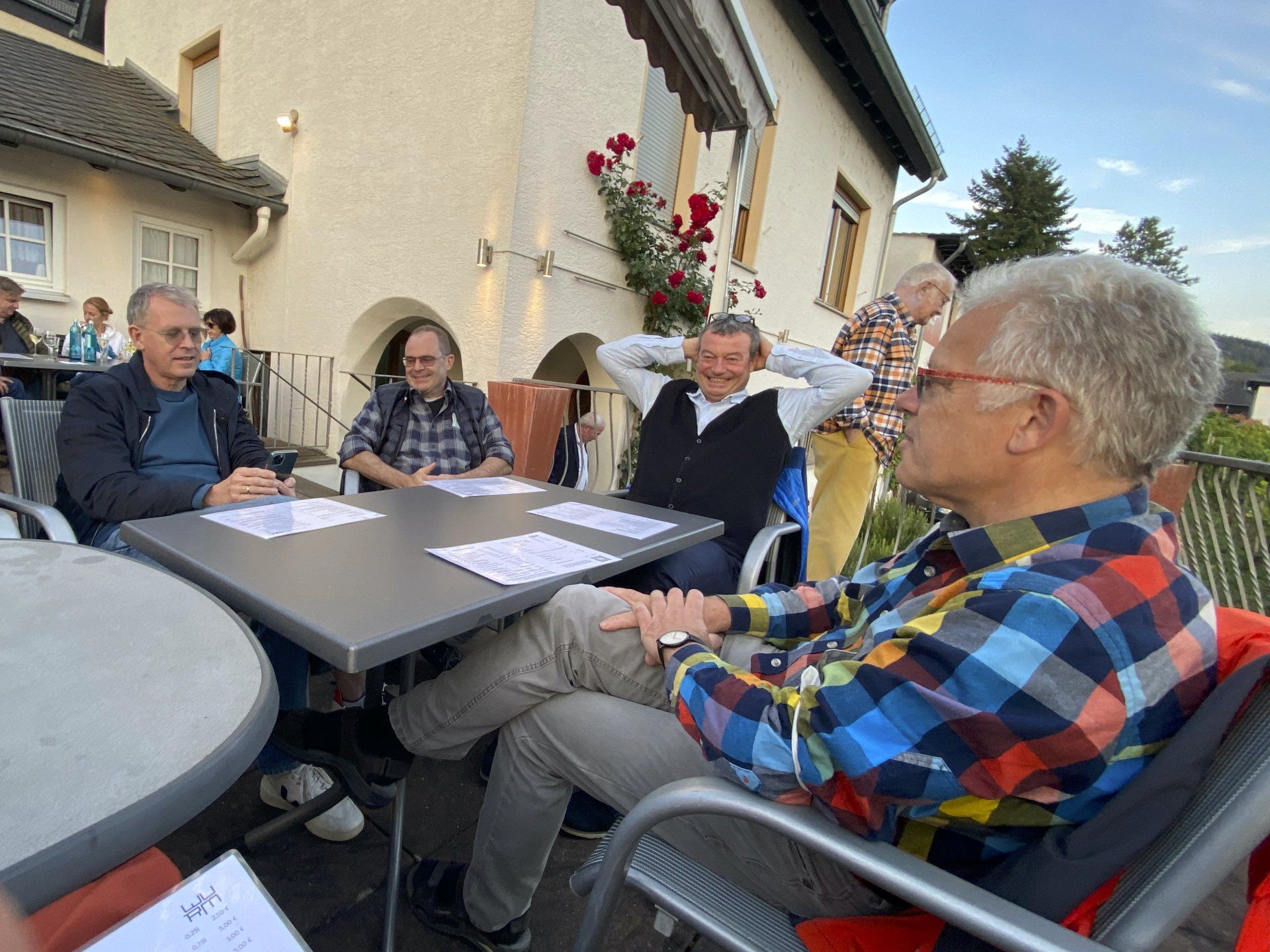 Weinwirtschaft Laquai ab, wo man im lauschigen Außenbereich Platz nahm und – nach leicht zurückhaltendem Start – dank Zuführung schmackhafter Nahrung sowie bereitwilliger Leerung mehrerer Flaschen Spätburgunder – zu ganz großer Form auflief. Beschwingt und leicht benebelt strebte man dann den blitzsauberen Hotelbetten entgegen – in froher Erwartung des ersten Wandertags.