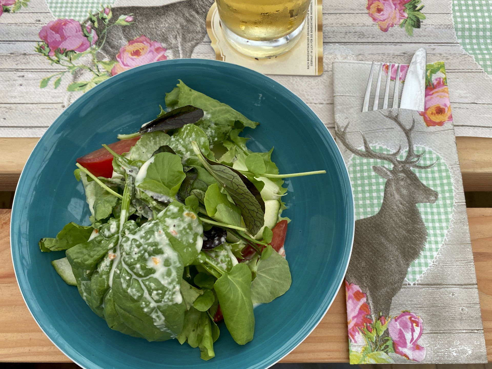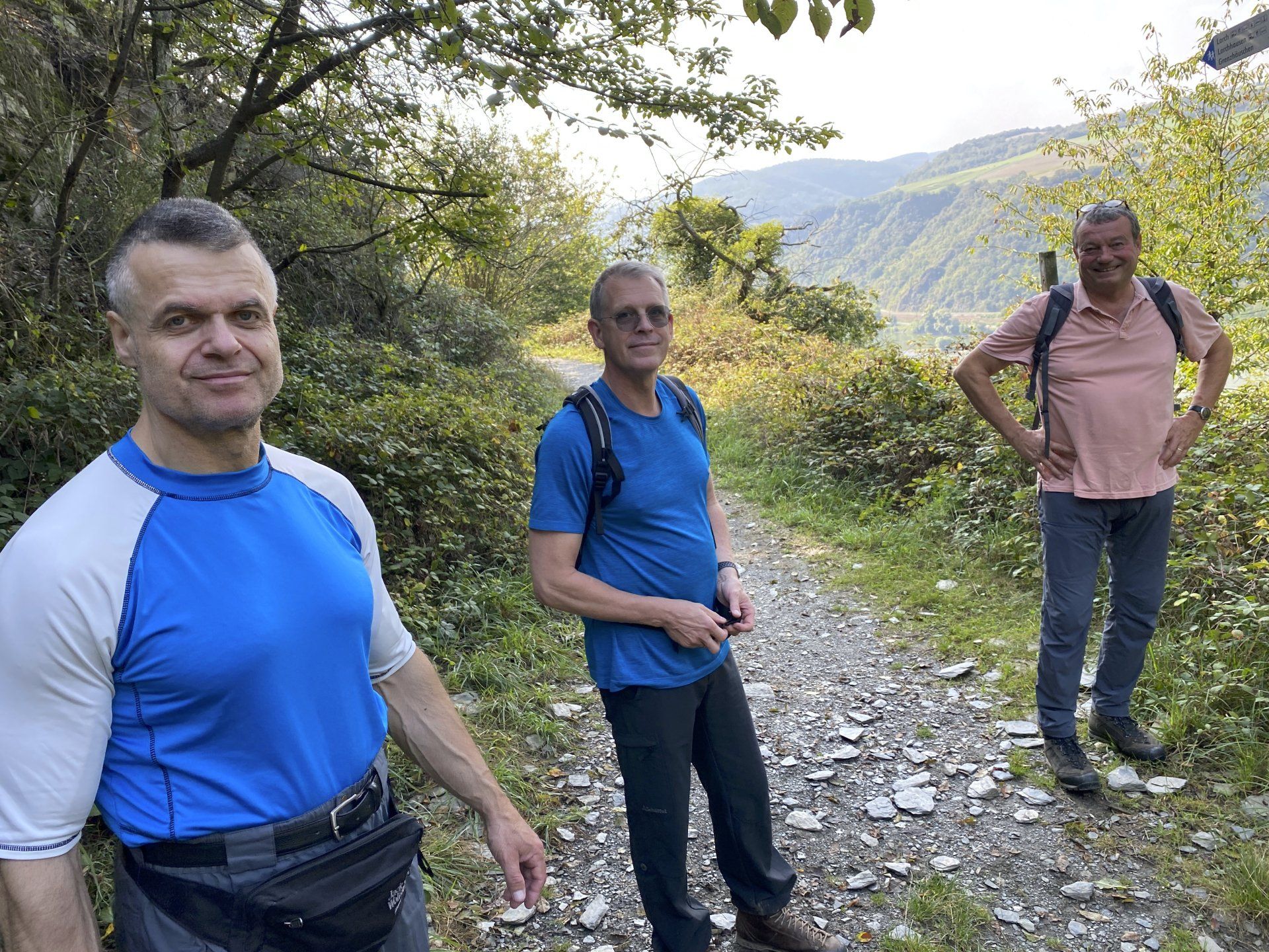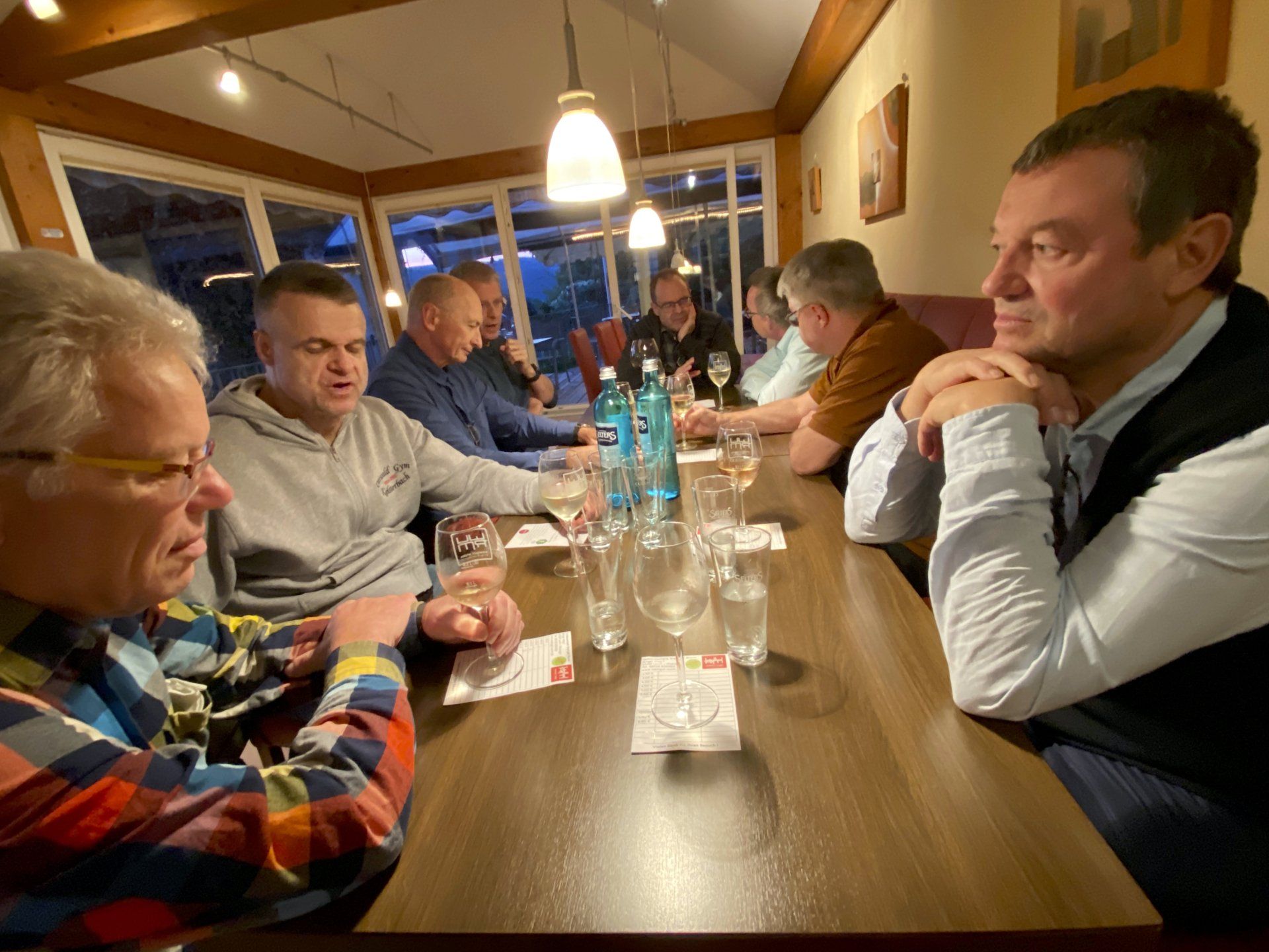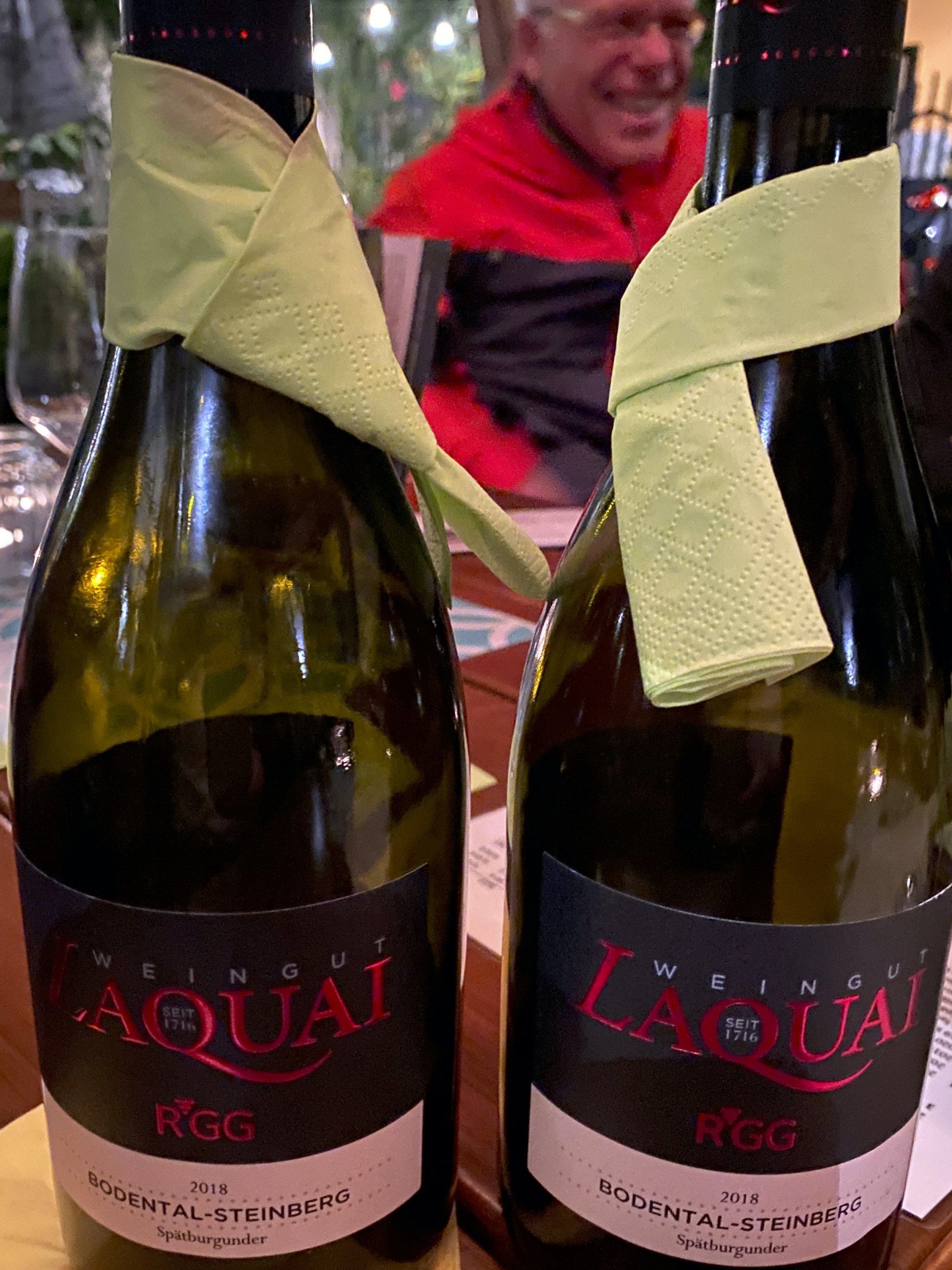 Weinwirtschaft Laquai ab, wo man im lauschigen Außenbereich Platz nahm und – nach leicht zurückhaltendem Start – dank Zuführung schmackhafter Nahrung sowie bereitwilliger Leerung mehrerer Flaschen Spätburgunder – zu ganz großer Form auflief. Beschwingt und leicht benebelt strebte man dann den blitzsauberen Hotelbetten entgegen – in froher Erwartung des ersten Wandertags.