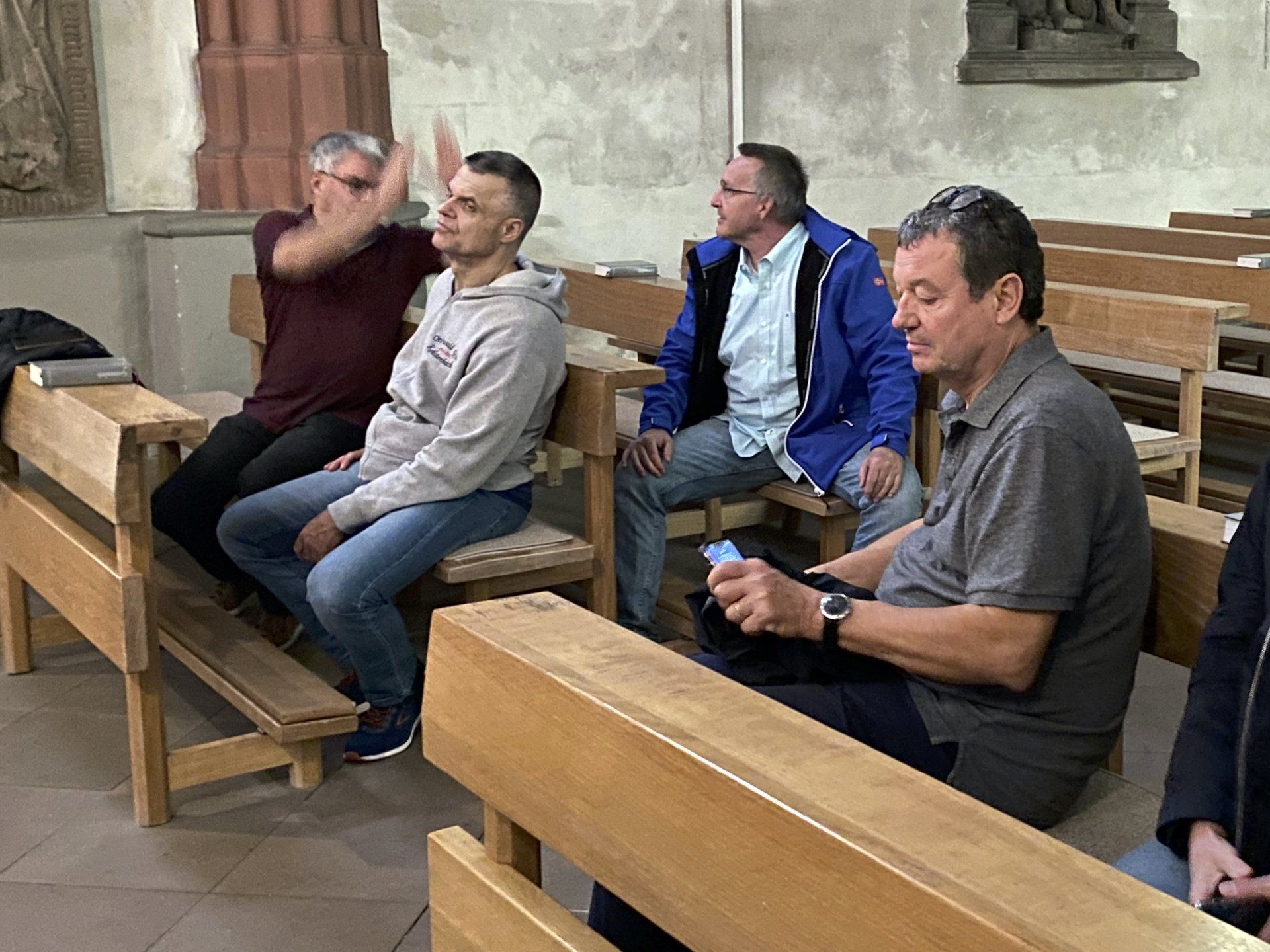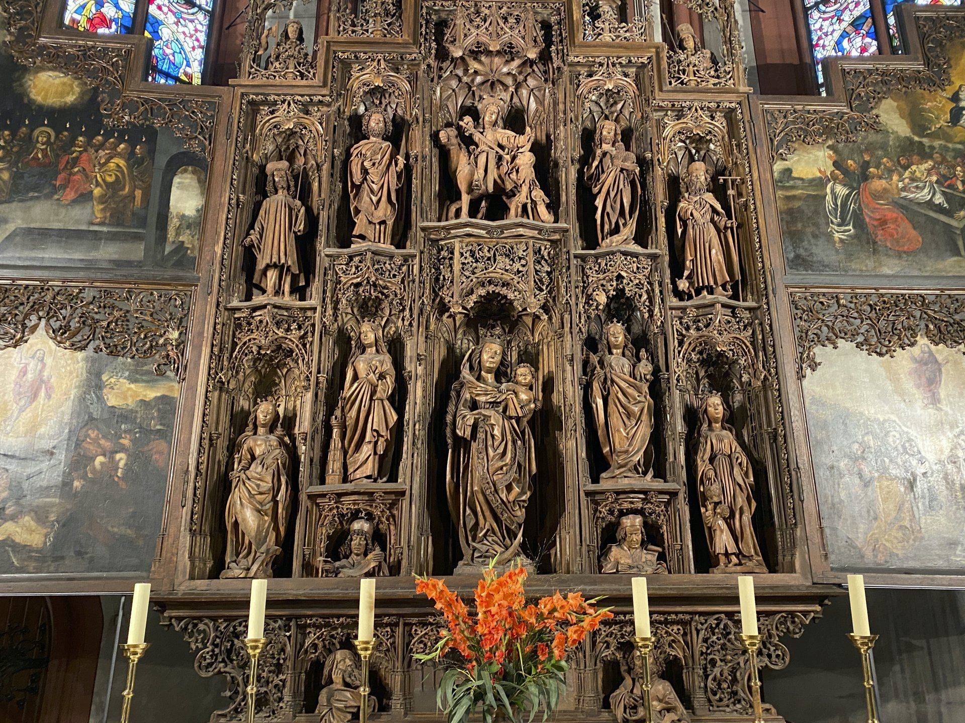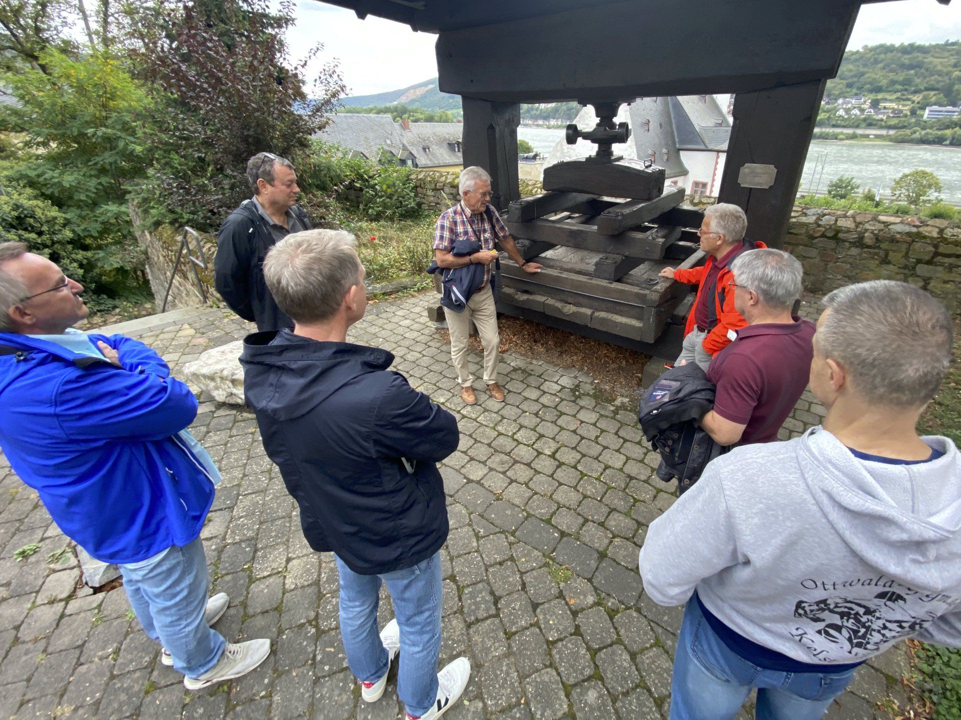 Schon nach wenigen Minuten gab’s eine erste Verschnaufpause auf dem Marktplatz direkt vor dem Rathaus, danach Besuch der ehemaligen, jetzt denkmalgeschützten Pfarrkirche St. Martin, seit 2002 Teil des UNESCO-Welterbes Oberes Mittelrheintal. Mittelpunkt der Kirche ist der prächtige, 1483 errichtete Hochaltar, der als größter und ältester nachgewiesener Holzschnitzaltar und als das wertvollste Kunstwerk im Bistum Limburg gilt. Eine weitere Besonderheit stellt das sogenannte „Riesling-Register“ der Orgel dar. Nach Betätigung des Registerzuges „Riesling 2f“ ertönt Vogelgezwitscher und es öffnet sich eine kleine Tür, hinter der zwei Flaschen Riesling und zwei Weingläser versteckt sind. All diese Fakten brachten die Herren nicht nur zum Staunen, sondern auch in Stimmung. Nach weiteren Zwischenstopps, unter anderem am historischen Hilchenhaus und am Leprosenhaus, setzte Gäste-Guide Schneider die hungrige Truppe Punkt 19 Uhr vor der