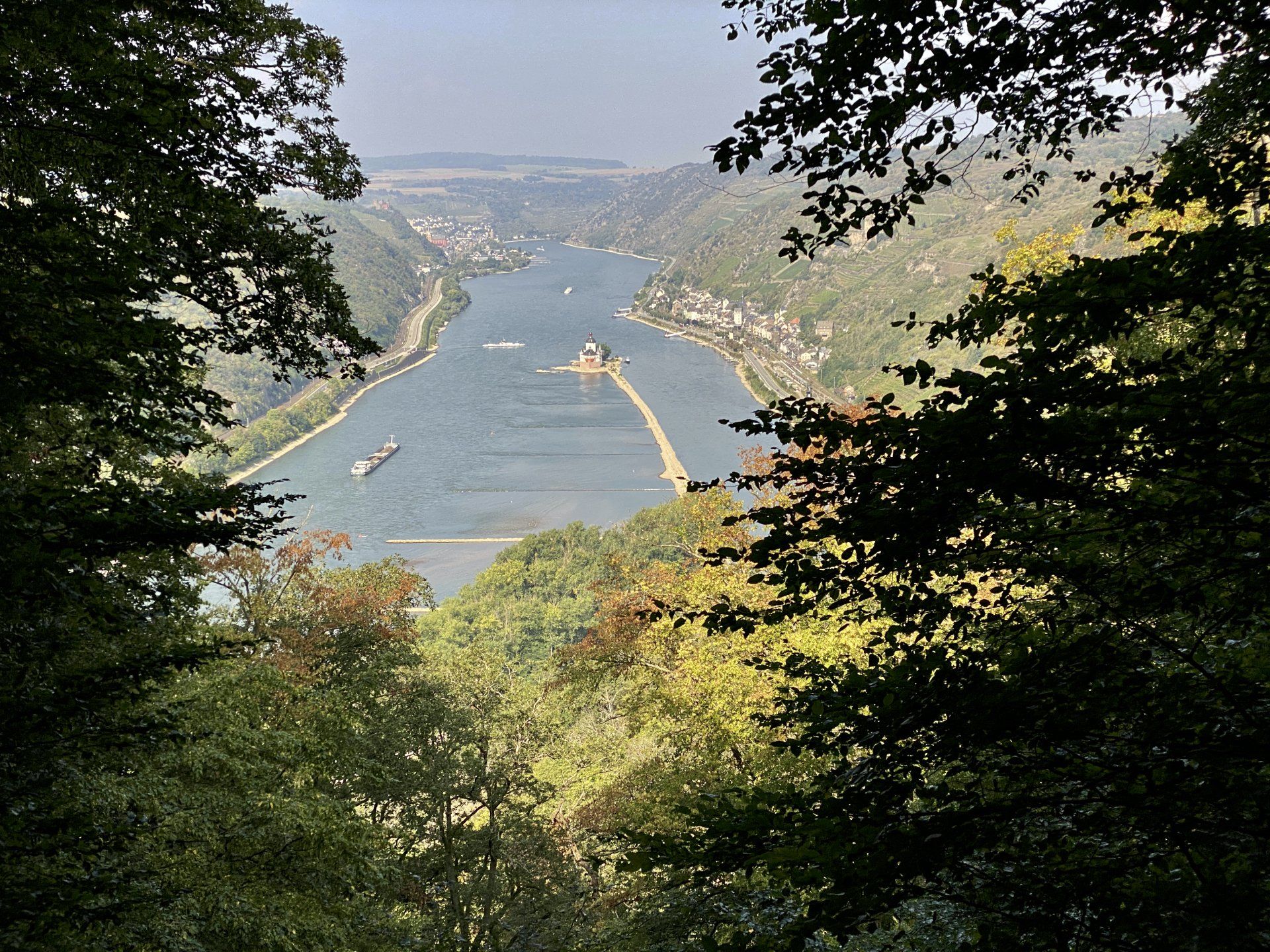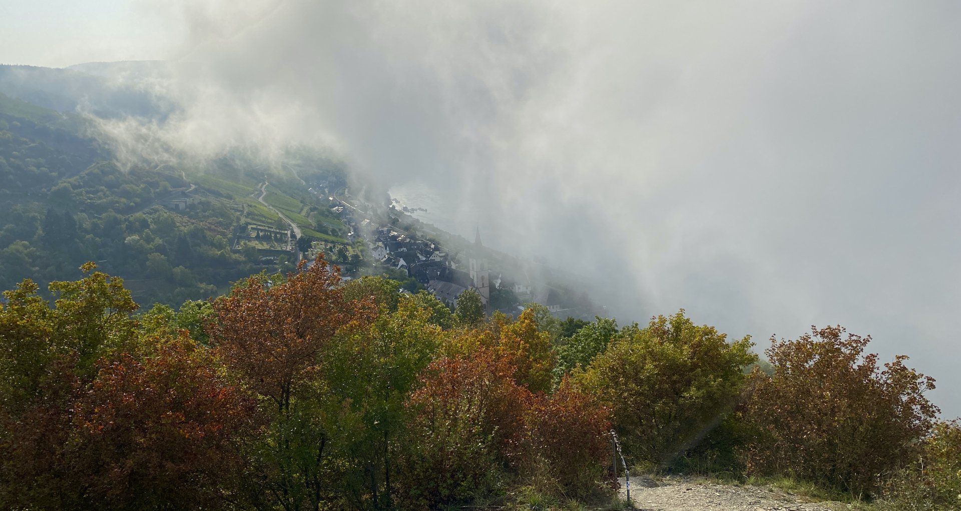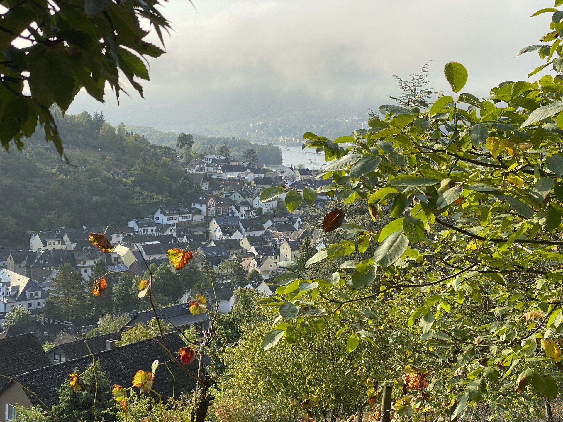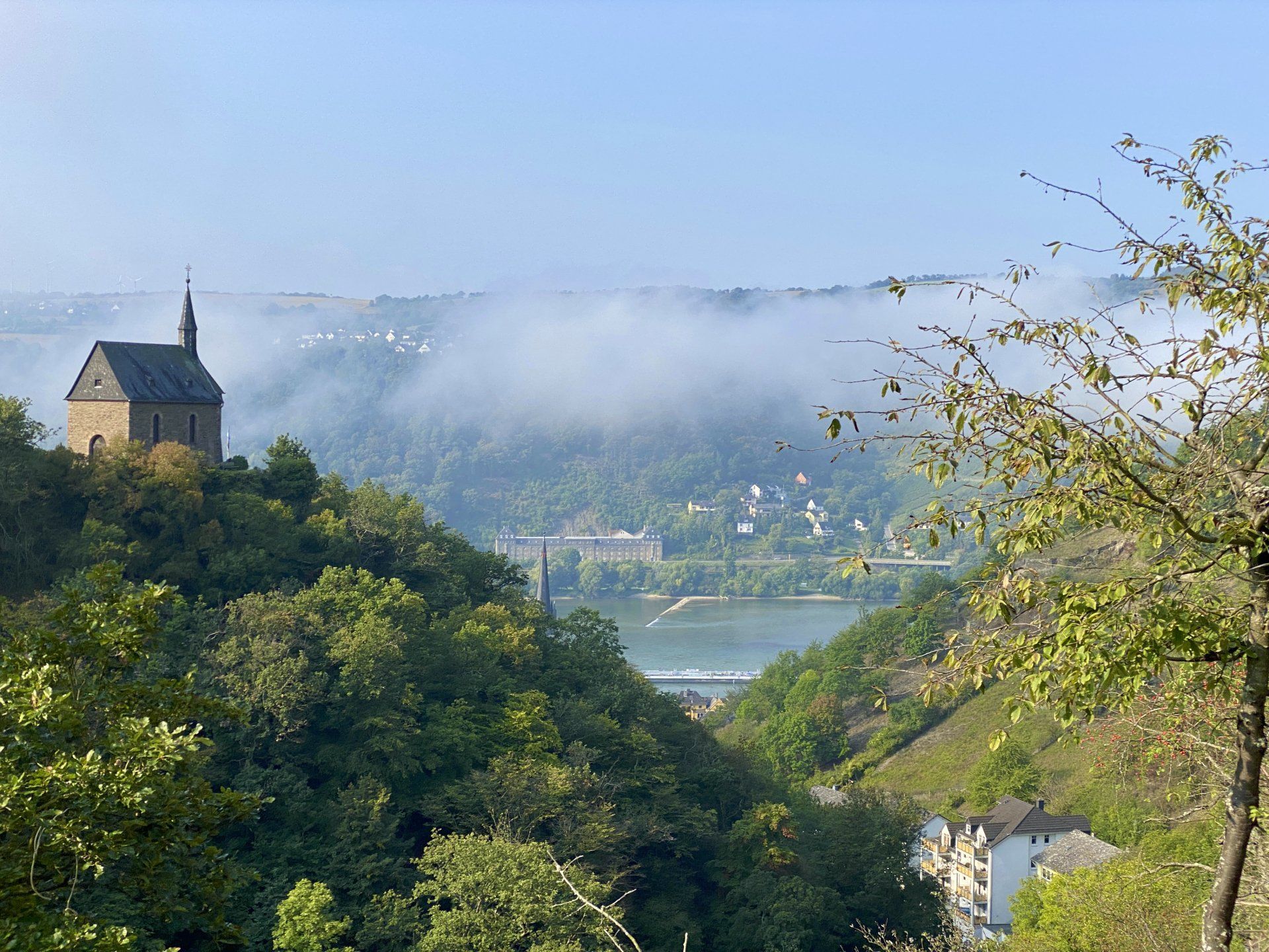 eine Wanderung auf dem Rheinsteig von Lorch nach Kaub. Los ging’s direkt vom „Hotel im Schulhaus“ aus, völlig unerschrocken übrigens, trotz Warnhinweisen, die darauf aufmerksam machten, dass der Weg anspruchsvoll sei und Trittsicherheit sowie Schwindelfreiheit erfordere. Letzteres war nach dem Exzess des vergangenen Abends sowieso nicht zu garantieren. Nach wenigen hundert Metern ging’s stramm bergauf, die Waden schmerzten, die Lungen keuchten – es war herrlich … zumal die Sonne schon bald den Nebel vertrieb und wunderbare Aussichten auf das Rheintal freigab. Die Szenerie wirkte wie gemalt – fast zu schön, um wahr zu sein. Ein Zwischenstopp war diesmal beim