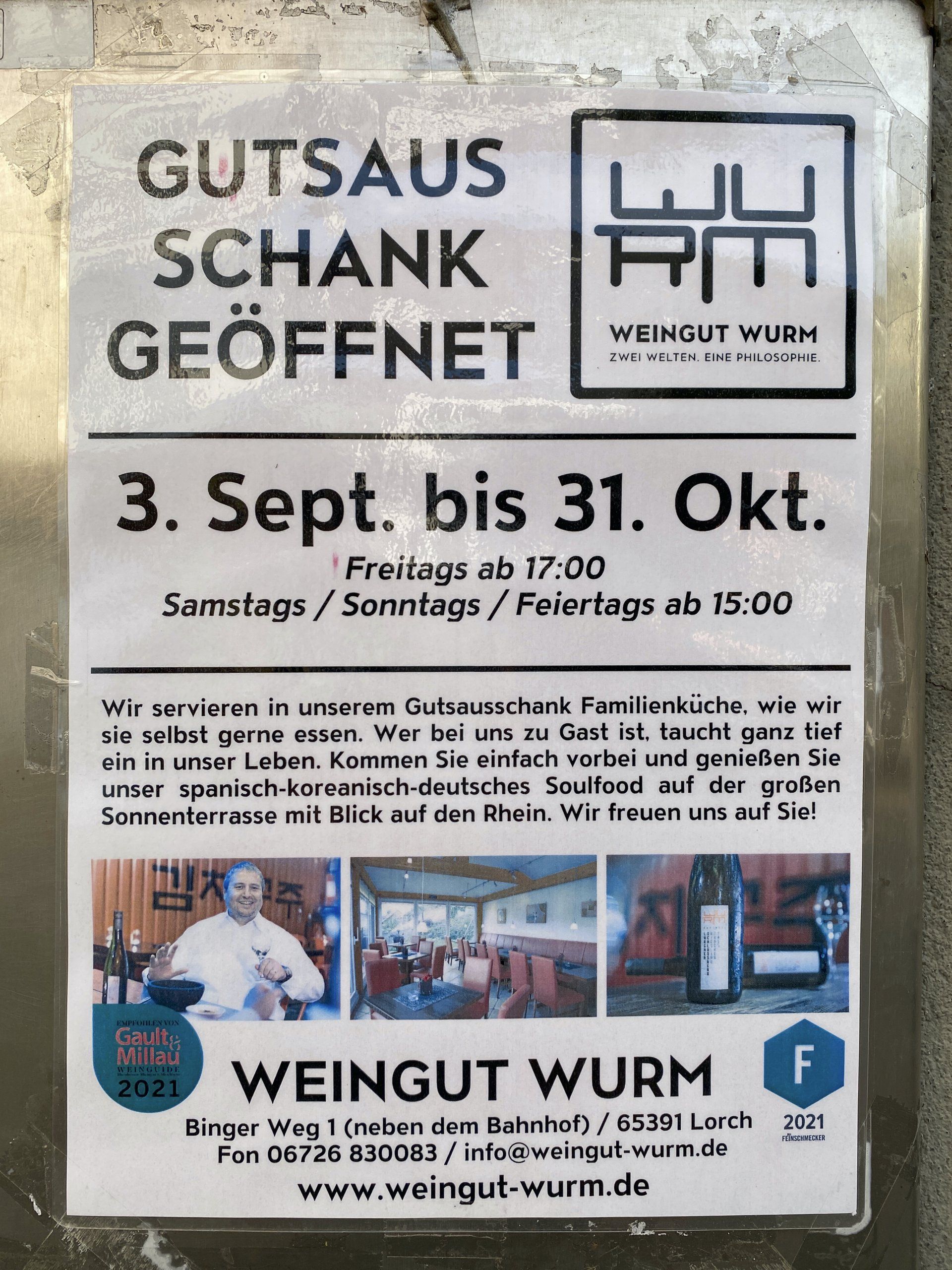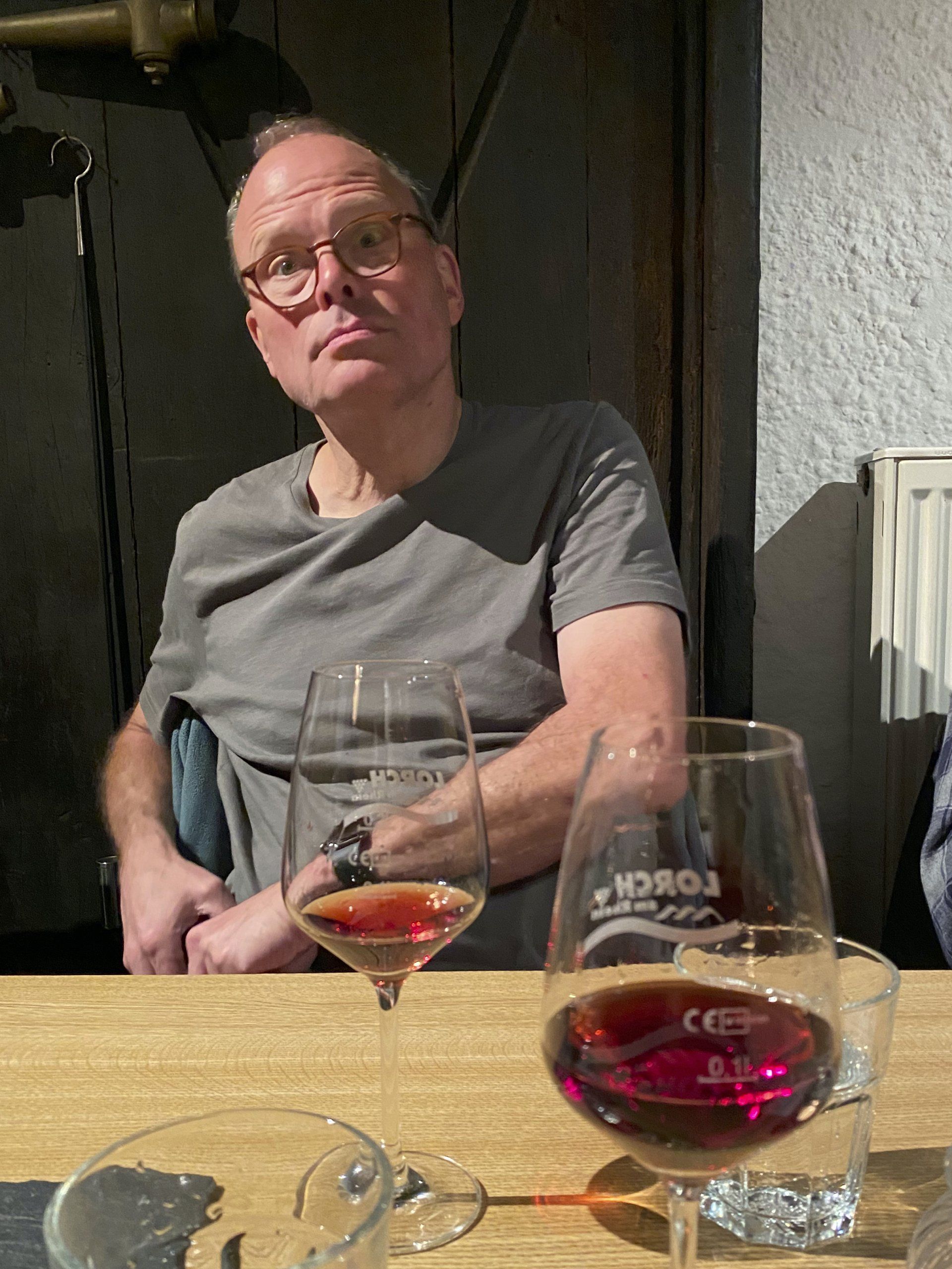 Dabei begann alles ganz harmlos: Ganz am Ende von Lorch (mancher hatte die Hoffnung schon aufgegeben) liegt das Weingut von Robert Wurm, der im Jahr 2014 das 1841 gegründete Lorcher Weingut Ottes übernommen und sich damit einen Traum erfüllt hat: „Raus dem Konzern-Chefsessel, rein in die Arbeitskleidung. Ein überragendes Gefühl!“, wie er nassforsch bekennt. Die Internetseite des Wurms hatte neugierig gemacht: Schon seit seiner Jugend betreibe er Kampfsportarten wie Taekwondo oder Hapkido, sei mittlerweile stolzer Träger des 6. (Steely) Dans und gehöre damit zur Kendō-Elite Europas. Korea und Lorch, Kampfsport und Wein – Wurm vereine zwei Welten zu einer Philosophie. Eine Aufgabe, die Geduld, Präzision und Hingabe erfordere. Beim Warmlaufen auf der etwas kühlen Terrasse mit Blick auf den schönen Rhein und akustischer Untermalung durch kreischende Züge, wussten die Wanderer noch nicht, dass auch von ihnen an diesem Abend insbesondere Geduld verlangt werden sollte, während Wurm die beiden anderen Ingredienzien seines Lebensstils (Präzision und Hingabe) sträflich vernachlässigte. Um es kurz zu machen: Es dauerte über zwei Stunden, bis die bestellten Speisen die Tischplatte der mittlerweile in den Innenbereich umgezogenen Truppe erreichten.