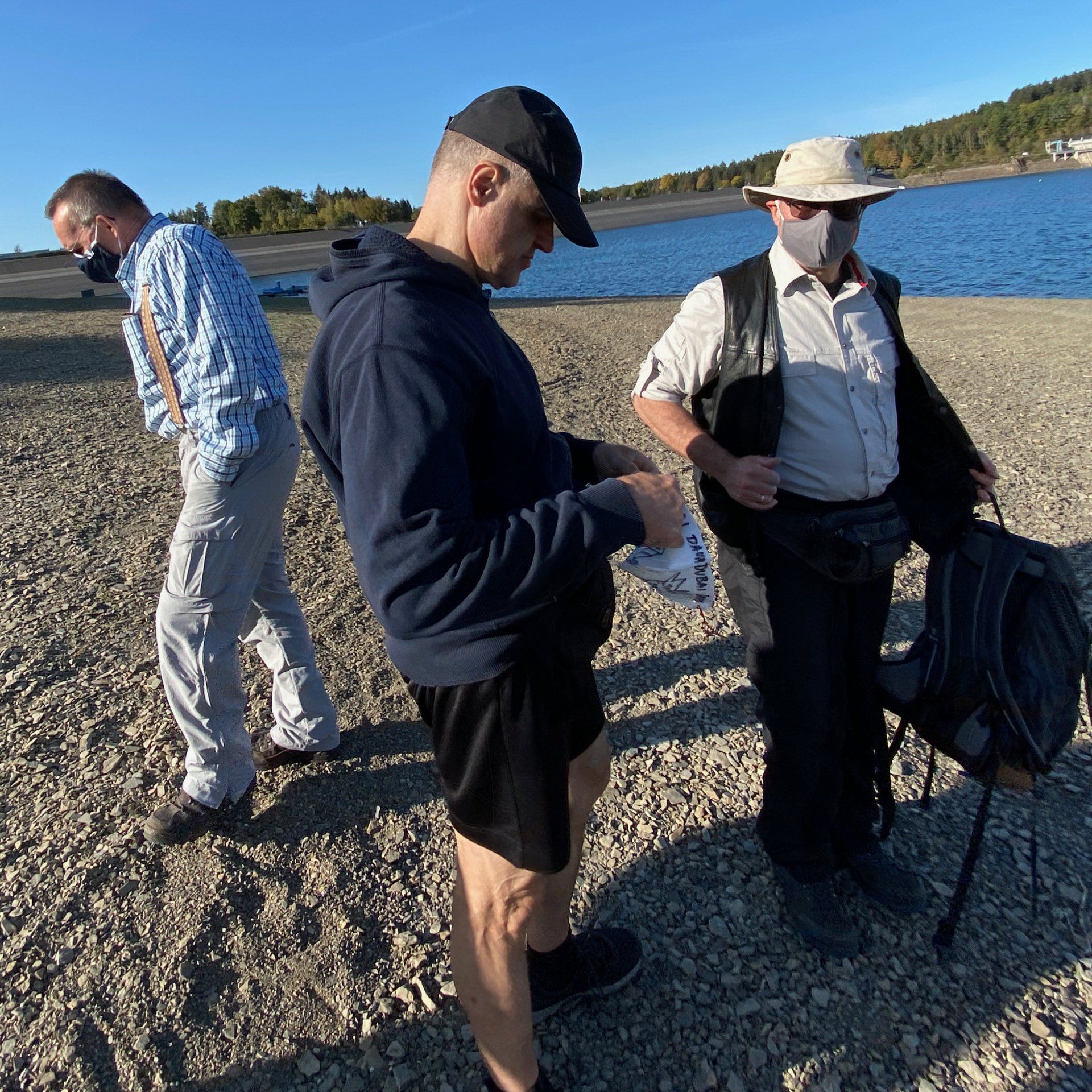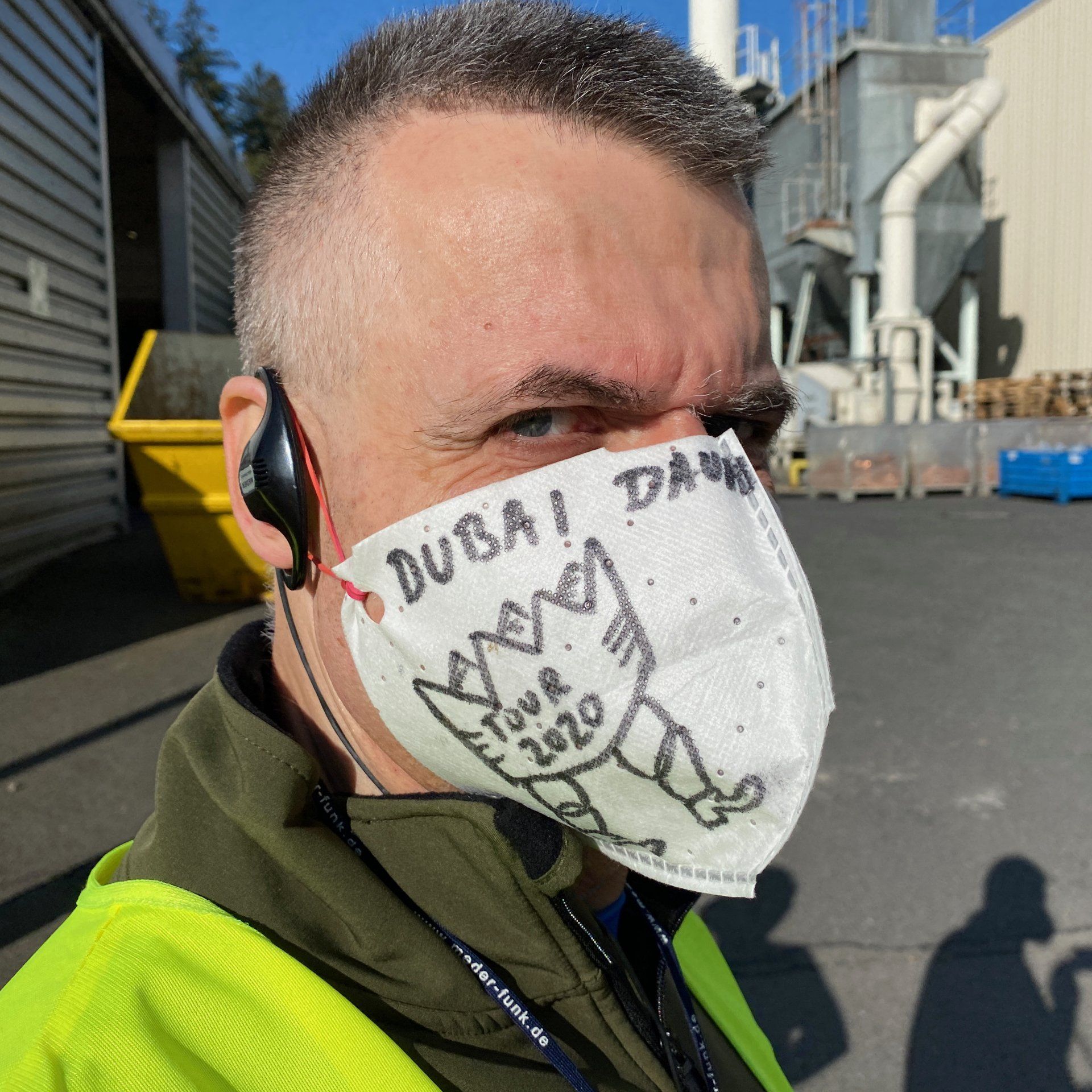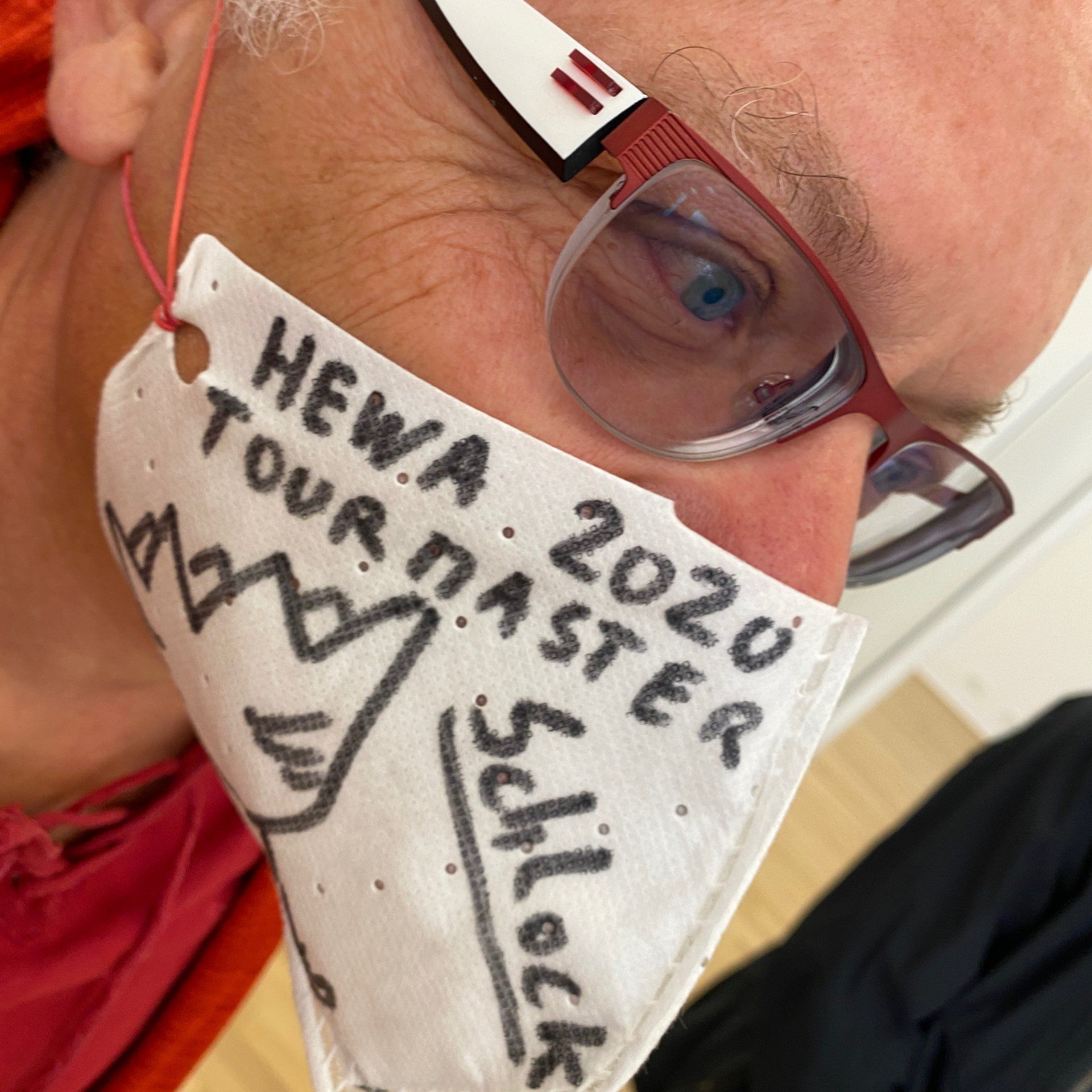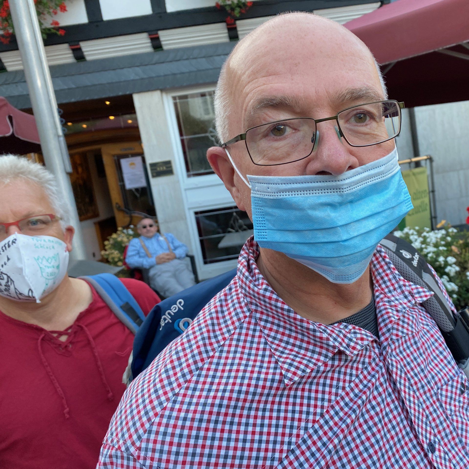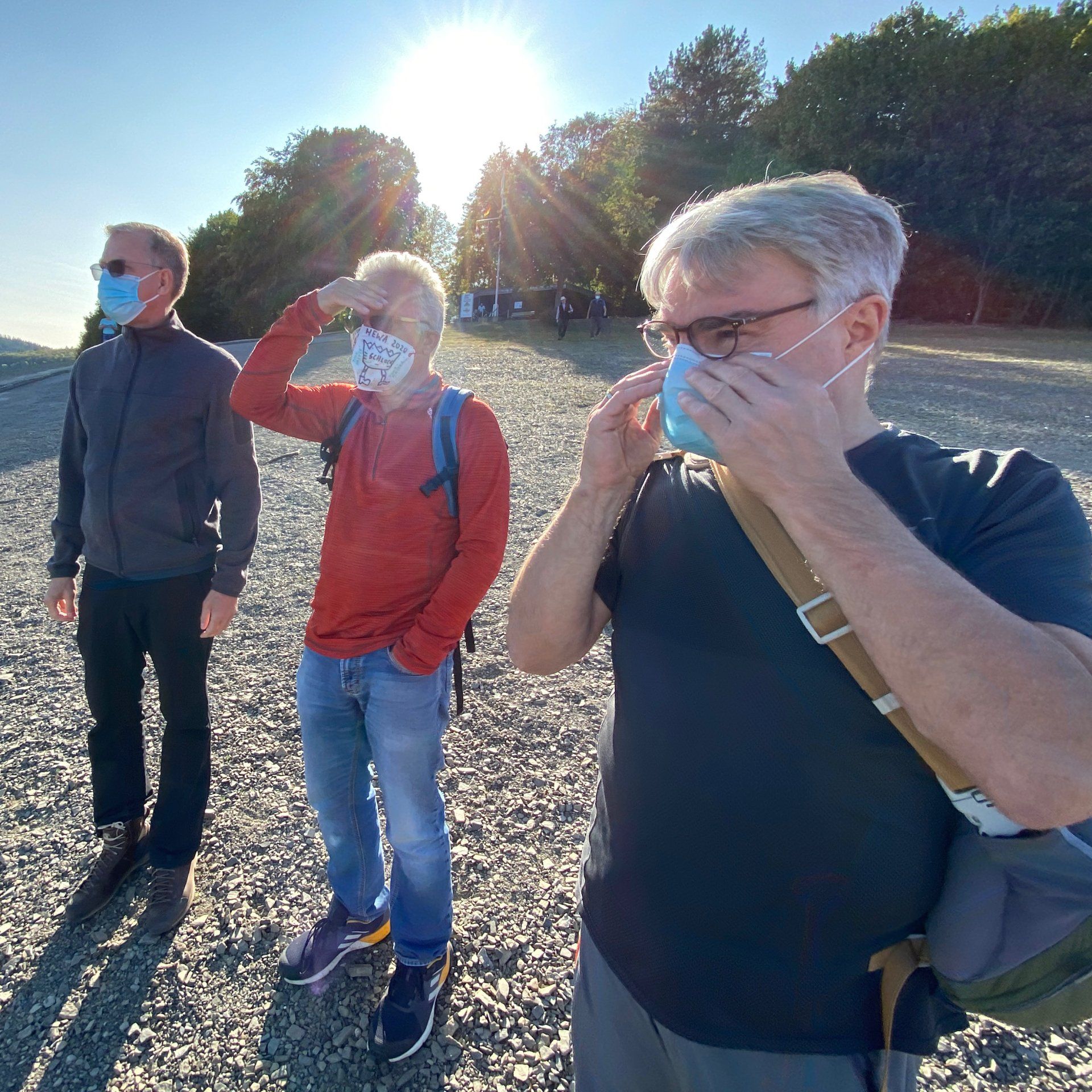 Es begann wie immer! Vor dem Ärztehaus der Opelstadt fand sich das Gros der Wanderwilligen pünktlich gegen 14.30 Uhr ein – lediglich Joe hatte sich wie gewohnt für eine individuelle Anreise entschieden, und auch Dr. Schoko wählte von Kassel aus den direkten „smarten“ Weg. Wer vor dem Start genau hinschaute, der entdeckte in Rüsselsheim schnell ein neues Gesicht: Ove-Jens Jahn alias „O-Jay-Jay“, in den achtziger Jahren Mitglied der Marxstraßen-Kommune, fuhr mit gestutzter Lockenpracht im schwarzen VW Multivan vor, um als erster Neuzugang in der Geschichte der Herrenwanderer sein Debüt zu geben. Schieben wir’s nicht auf die lange Bank: Er bestand die Aufnahmeprüfung mit Bravour! Kein Wunder, denn als erfahrener Kranich-Pilot brachte er beste Voraussetzungen mit, um für frischen Wind zu sorgen und auftretende Turbulenzen im Nu gekonnt abzufedern. Tourmaster Schlock hatte unmittelbar vor dem Start schon die erste Überraschung parat – in Form von personifizierten und liebevoll per Hand bemalten Virenschutzmasken aus Staubsaugertüten-Zellstoff, die er jedem Teilnehmer in doppelter Ausfertigung in die Hand drückte.
