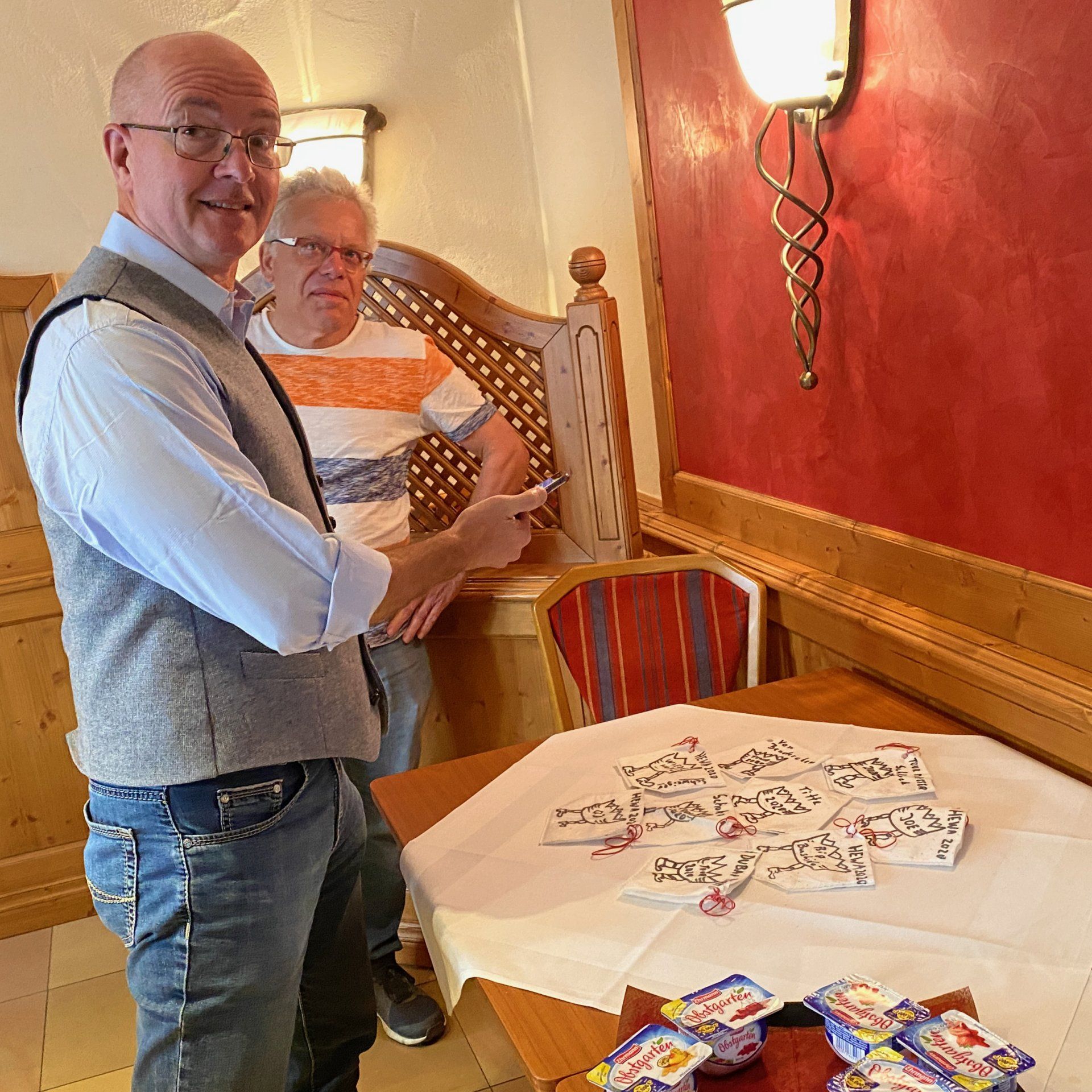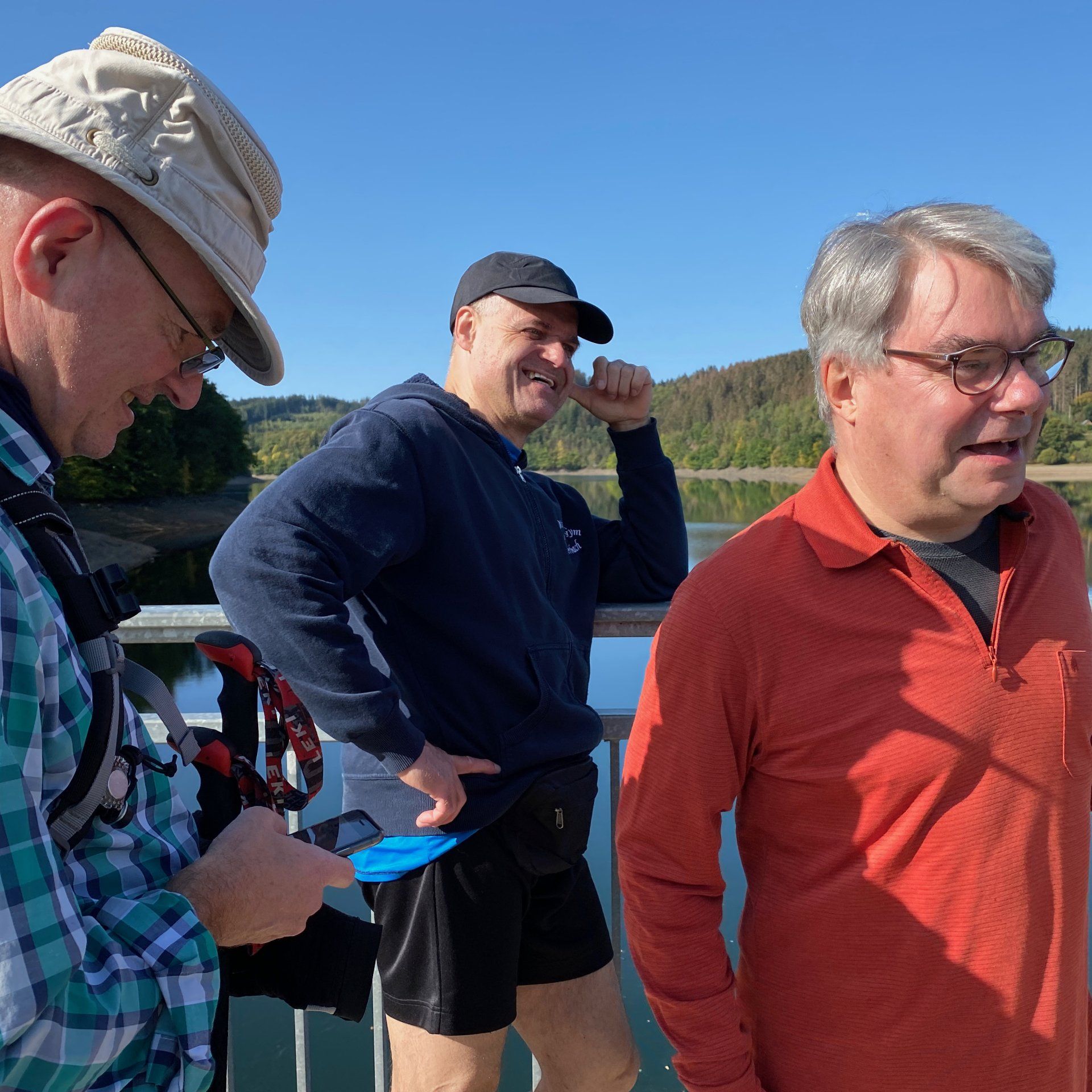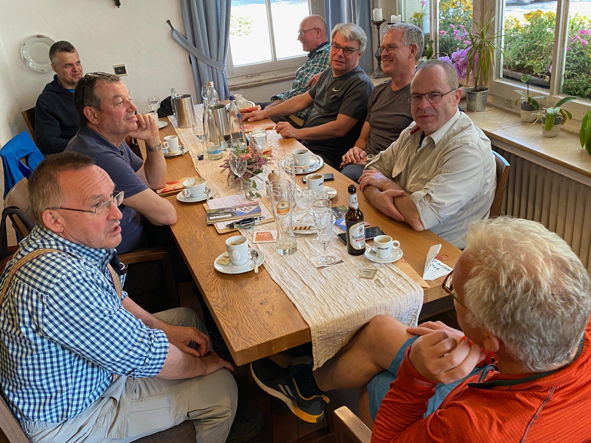 „MS Westfalen“ ging es wenig später auf der Wasserstraße nach Sondern und von dort aus zurück ins Quartier, wo alle ein wenig ruhten, ehe gegen 19 Uhr – diesmal in der „Alten Quelle“ – die abendliche Aufnahme von Speisen und Getränken startete. Derweil der FC Bayern im ersten Spiel der neuen Bundesligarunde aus Schalke 04 Schalke 0:8 machte, drehten die wohlig ermatteten Herrenwanderer manch heikles Thema durch den rhetorischen Wolf, wie immer garniert von ausgelassenen Lachsalven. Auch Kemper-Marketier Stephan Hansmann ergänzte kurz die Runde, die das kupferfarbene (!) Bergische Landbier in Strömen fließen ließ.